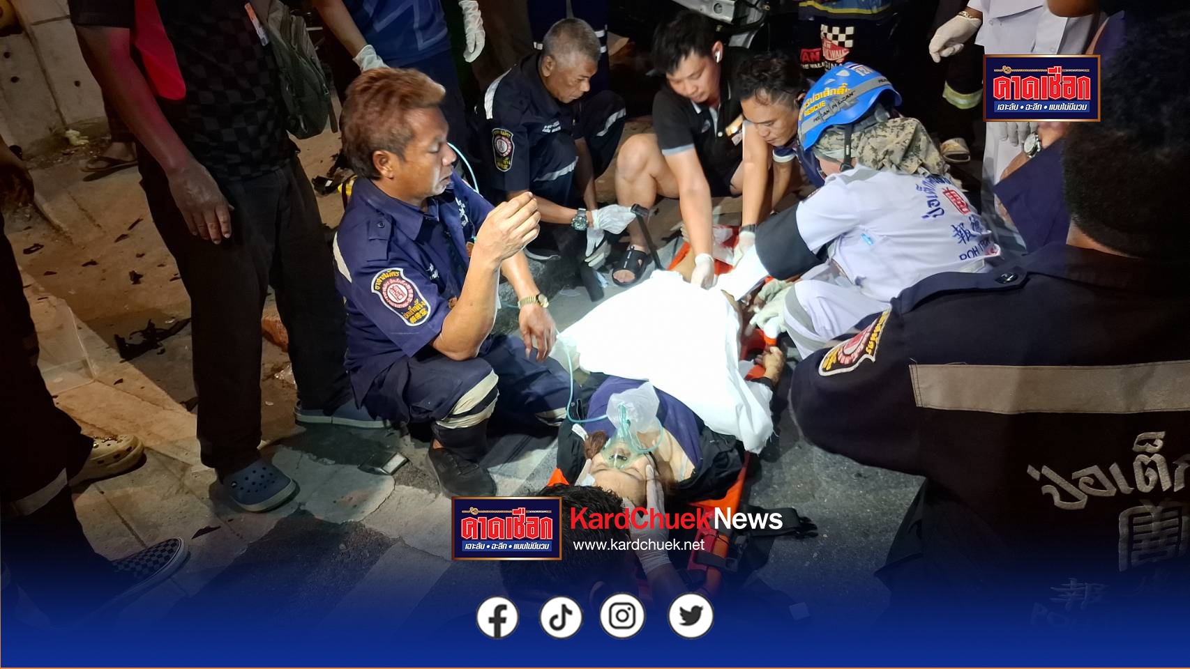 ห่างออกไปเล็กน้อย พบรถจักรยานยนต์ยามาฮ่า มีโอ สีดำ ทะเบียน ขษข 705 เชียงราย สภาพเสียหายทั้งคัน นายชาญชัย ฤกษ์พรมงคล อายุ 46 ปี ผู้ขับขี่ได้รับบาดเจ็บ นำส่ง