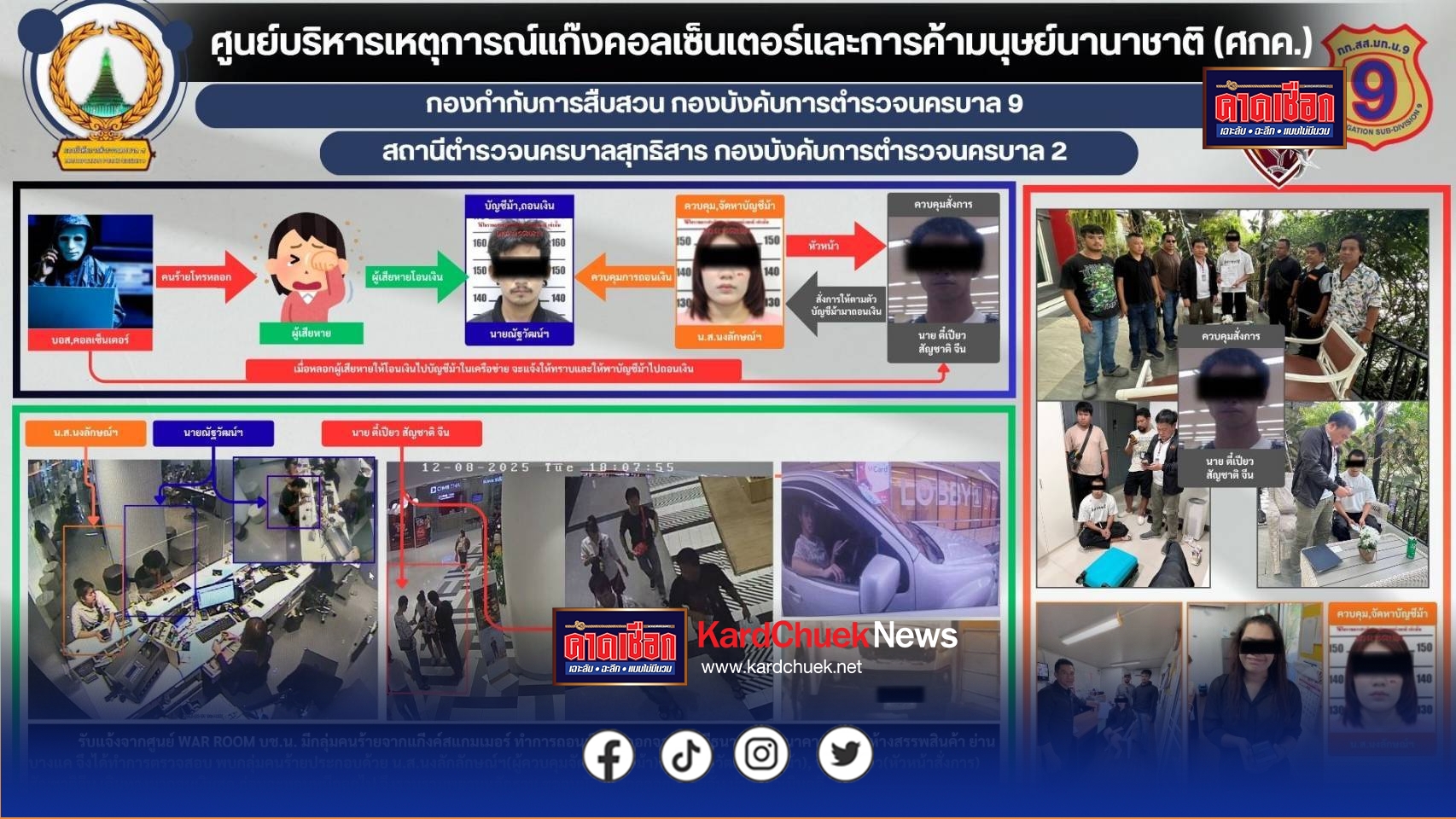 ต่อมาศูนย์บริหารเหตุการณ์แก๊งคอลเซ็นเตอร์และค้ามนุษย์นานาชาติ (ศกค.) โดย พล.ต.อ.ธนา ชูวงศ์ รอง.ผบ.ตร./ผอ.ศปอส.ตร./ผบ.ศกค. ได้สั่งการให้ พล.ต.ท.สยาม บุญสม ผบช.น./ผอ.ศปอส.บช.น. พล.ต.ต.วสันต์ เตชะอัครเกษม รอง ผบช.น./รอง ผอ.ศปอส.บช.น. พล.ต.ต.โชติวัฒน์ เหลืองวิลัย ผบก.สส.บช.น./เลขาฯ ศปอส.บช.น.และ พล.ต.ต.สามารถ พรหมชาติ ผบก.น.9/ผอ.ศปอส.บก.น.9 พล.ต.ต.เกียรติกุล สนธิเณร ผบก.น.2/ผอ.ศปอส.บก.น.2 มอบหมายให้ พ.ต.อ.ธีระชัย ฯ รอง ผบก.น.9 ได้สั่งการให้ฝ่ายสืบสวน บก.น. 9 ทำการสืบสวน โดยผู้เสียหายมีการโอนเงินจากบัญชีธนาคารกรุงเทพไปยังบัญชีธนาคารหลายบัญชี หนึ่งในนั้นคือบัญชีธนาคารไทยพาณิชย์ โดยมีการเบิกเงินสดออกจากบัญชี เมื่อวันที่ 12 ส.ค.68 จากการตรวจสอบเป็นบัญชีชื่อคนไทย