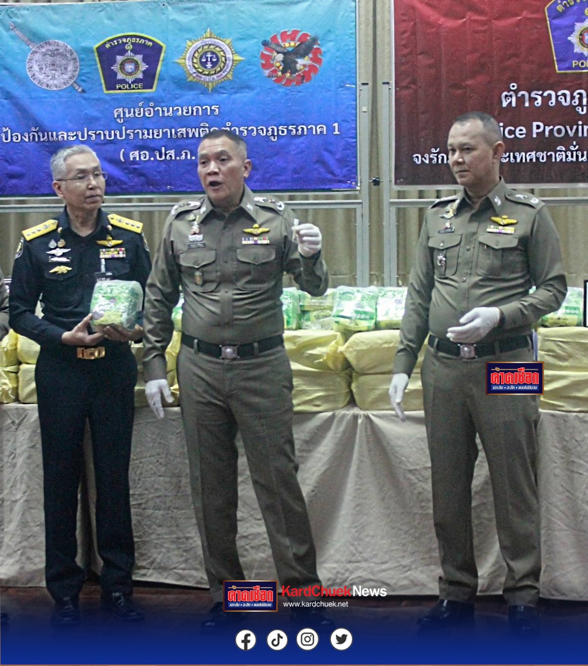 วันที่ 20 พ.ย.68 เวลา09.30น. ที่กองบัญชาการตำรวจภูธรภาค1 เขตจตุจักร กทม.พล.ต.ท.วัฒนา ยี่จีน ผบช.ภ.1, พล.ต.ต.วิชิต บุญชินวุฒิกุล รอง ผบช.ภ.1, พล.ต.ต.พรพิทักษ์ รู้ยืนยง รอง ผบช.ภ.1, พล.ต.ต.สถาพร เอมโอษฐ์ รอง จตร. ปฏิบัติราชการ ภ.1, พล.ต.ต.วรชาติ แสนคำผบก.สส.ภ.1, พล.ต.ต.สุรวุฒิ แสงรุ่งเรือง ผบก.ภ.จ.พระนครศรีอยุธยา พร้อมกำลังเจ้าหน้าที่ตำรวจชุดจับกุมร่วมแถลการจับกุมยาไอซ์ จำนวน 34 กระสอบ