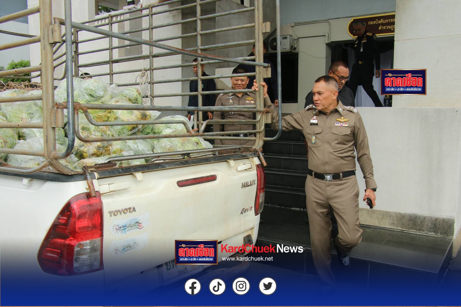 จนกระทั่งเวลาประมาณ 12.00 น. เจ้าหน้าที่ตำรวจชุดจับกุมได้ตรวจพบรถยนต์กระบะคอกบรรทุกผักไว้ท้ายรถ