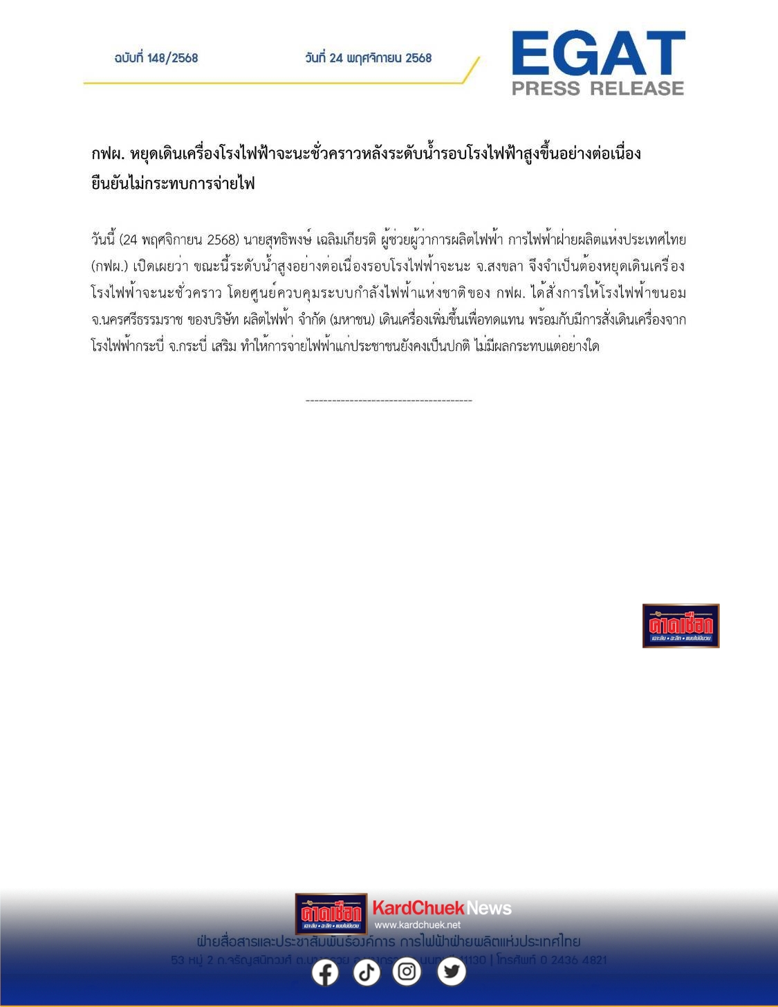 เมื่อวันนี้ 24 พ.ย.2568 ที่ผ่านมา นายสุทธิพงษ์ เฉลิมเกียรติ ผู้ช่วยผู้ว่าการผลิตไฟฟ้า การไฟฟ้าฝ่ายผลิตแห่งประเทศไทย (กฟผ.) เปิดเผยว่าขณะนี้ระดับน้ำสูงอย่างต่อเนื่องรอบโรงไฟฟ้าจะนะ จ.สงขลา จึงจำเป็นต้องหยุดเดินเครื่องโรงไฟฟ้าจะนะชั่วคราว โดยศูนย์ควบคุมระบบกำลังไฟฟ้าแห่งชาติของ กฟผ. ได้สั่งการให้โรงไฟฟ้าขนอม จ.นครศรีธรรมราช ของบริษัท ผลิตไฟฟ้า จำกัด (มหาชน) เดินเครื่องเพิ่มขึ้นเพื่อทดแทน พร้อมกับมีการสั่งเดินเครื่องจากโรงไฟฟ้ากระบี่ จ.กระบี่ เสริม ทำให้การจ่ายไฟฟ้าแก่ประชาชนยังคงเป็นปกติ ไม่มีผลกระทบแต่อย่างใด