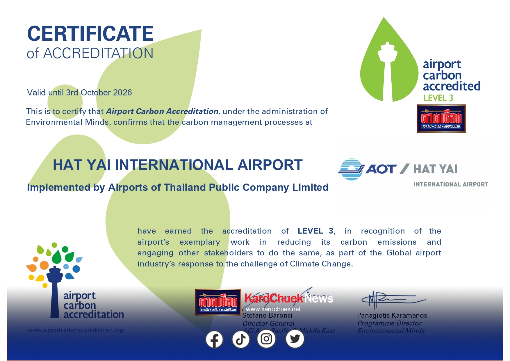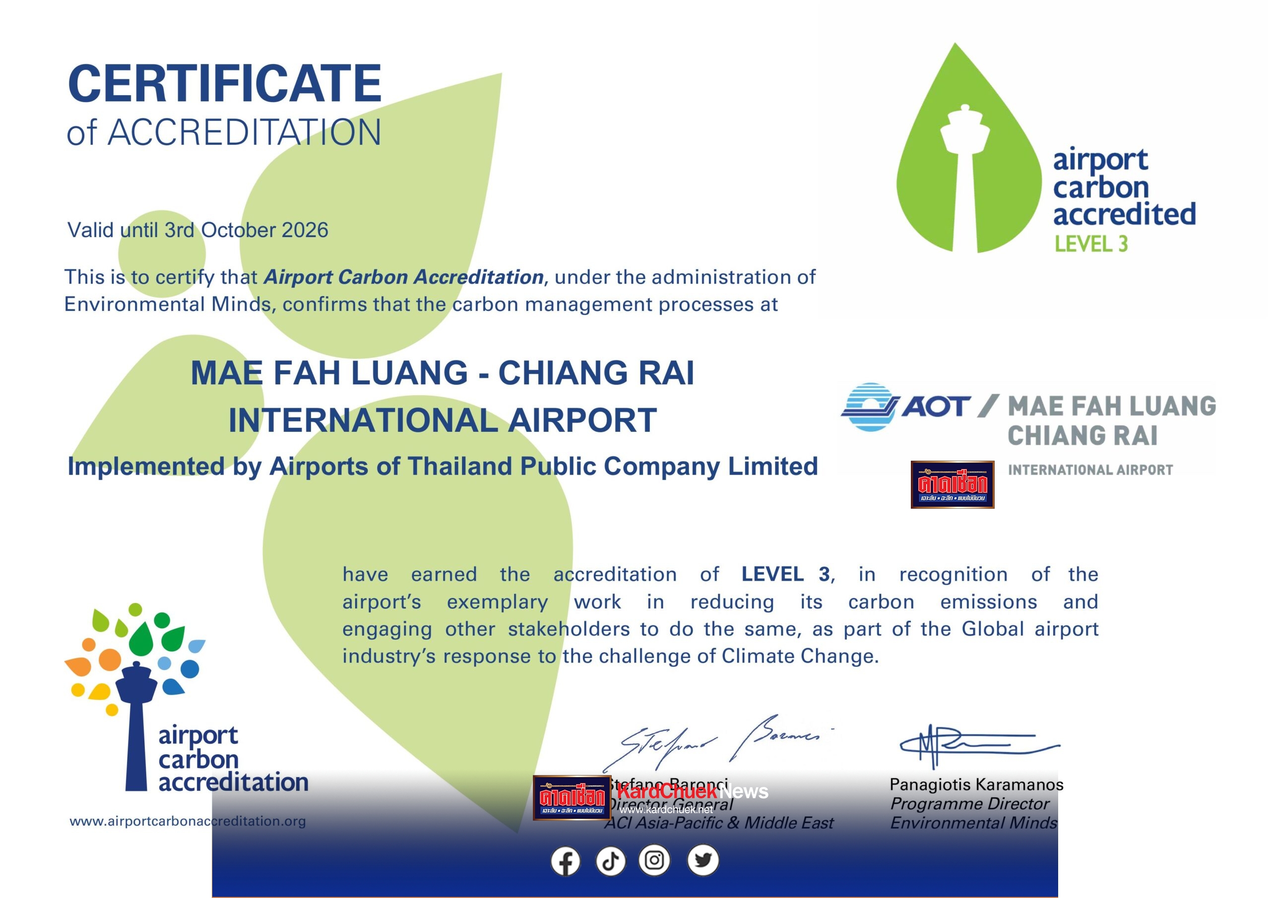 *****บริษัท ท่าอากาศยานไทย จำกัด (มหาชน) (AOT) เดินหน้ารักษามาตรฐานความยั่งยืนด้านสิ่งแวดล้อมอย่างต่อเนื่อง โดยท่าอากาศยานสุวรรณภูมิ (ทสภ.) ท่าอากาศยานดอนเมือง (ทดม.) ท่าอากาศยานเชียงใหม่ (ทชม.) ท่าอากาศยานแม่ฟ้าหลวง เชียงราย (ทชร.) และท่าอากาศยานหาดใหญ่ (ทหญ.) ได้รับการรับรองตามโปรแกรม Airport Carbon Accreditation (ACA) ของ Airports Council International (ACI) ในระดับที่ 3 Optimisation ท่าอากาศยานภูเก็ต (ทภก.) ได้รับการรับรองในระดับที่ 2 Reduction