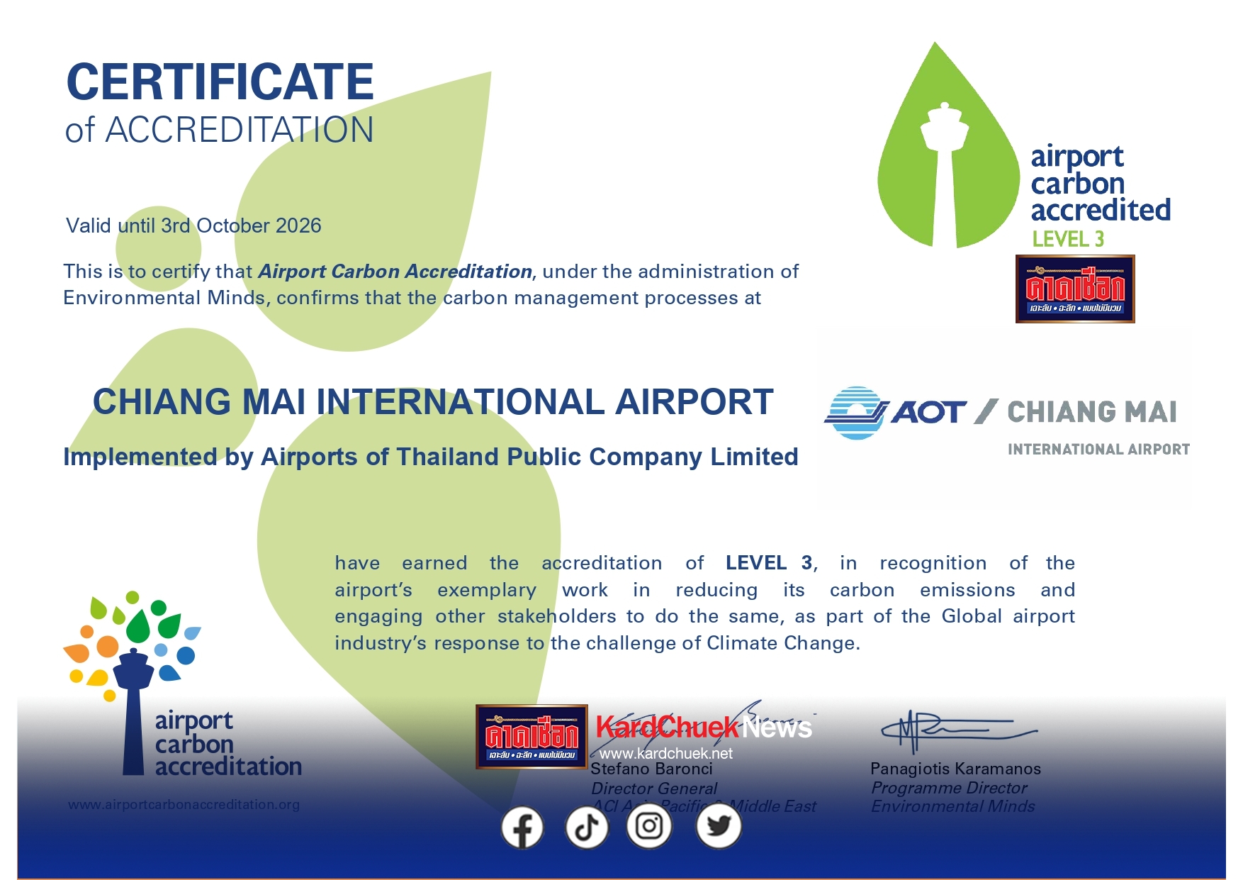 *****นางสาวปวีณา จริยฐิติพงศ์ รักษาการผู้อำนวยการใหญ่ AOT กล่าวว่าการที่ท่าอากาศยานทั้ง 6 แห่งของ AOT เข้าร่วมโปรแกรม ACA สะท้อนถึงเจตนารมณ์ในการรับผิดชอบต่อปัญหาการเปลี่ยนแปลงสภาพภูมิอากาศ โดยการประเมินปริมาณก๊าซเรือนกระจกในรูปคาร์บอนไดออกไซด์เทียบเท่า (CO₂e) ที่ปล่อยจากกิจกรรมภายในขอบเขตการปฏิบัติการของท่าอากาศยานตามแนวทาง Airport Carbon Accreditation Guidance Document ซึ่งผลการประเมินนี้ช่วยให้ท่าอากาศยานสามารถวางแนวทางบริหารจัดการและลดการปล่อยก๊าซเรือนกระจกได้อย่างเป็นระบบ ทั้งนี้ โปรแกรม ACA มีทั้งหมด 5 ระดับ โดยระดับที่สูงขึ้นสะท้อนถึงความเข้มข้นในการบริหารจัดการก๊าซเรือนกระจกของท่าอากาศยาน โดย AOT ได้ตั้งเป้าหมายการลดการปล่อยก๊าซเรือนกระจกอย่างชัดเจน โดย ทสภ. ทดม. ทชม และ ทภก.ตั้งเป้าลดการปล่อยก๊าซเรือนกระจกในกิจกรรมที่อยู่ภายใต้การควบคุมของท่าอากาศยานต่อผู้โดยสาร ร้อยละ 10 ภายในปี 2571 เมื่อเทียบกับปี 2566 ขณะที่ ทชร.และ ทหญ. ตั้งเป้าลดการปล่อยก๊าซเรือนกระจกต่อหน่วยรายได้ ร้อยละ 7 ภายในปีเดียวกัน เพื่อสนับสนุนการดำเนินงานที่เป็นมิตรต่อสิ่งแวดล้อมอย่างยั่งยืน