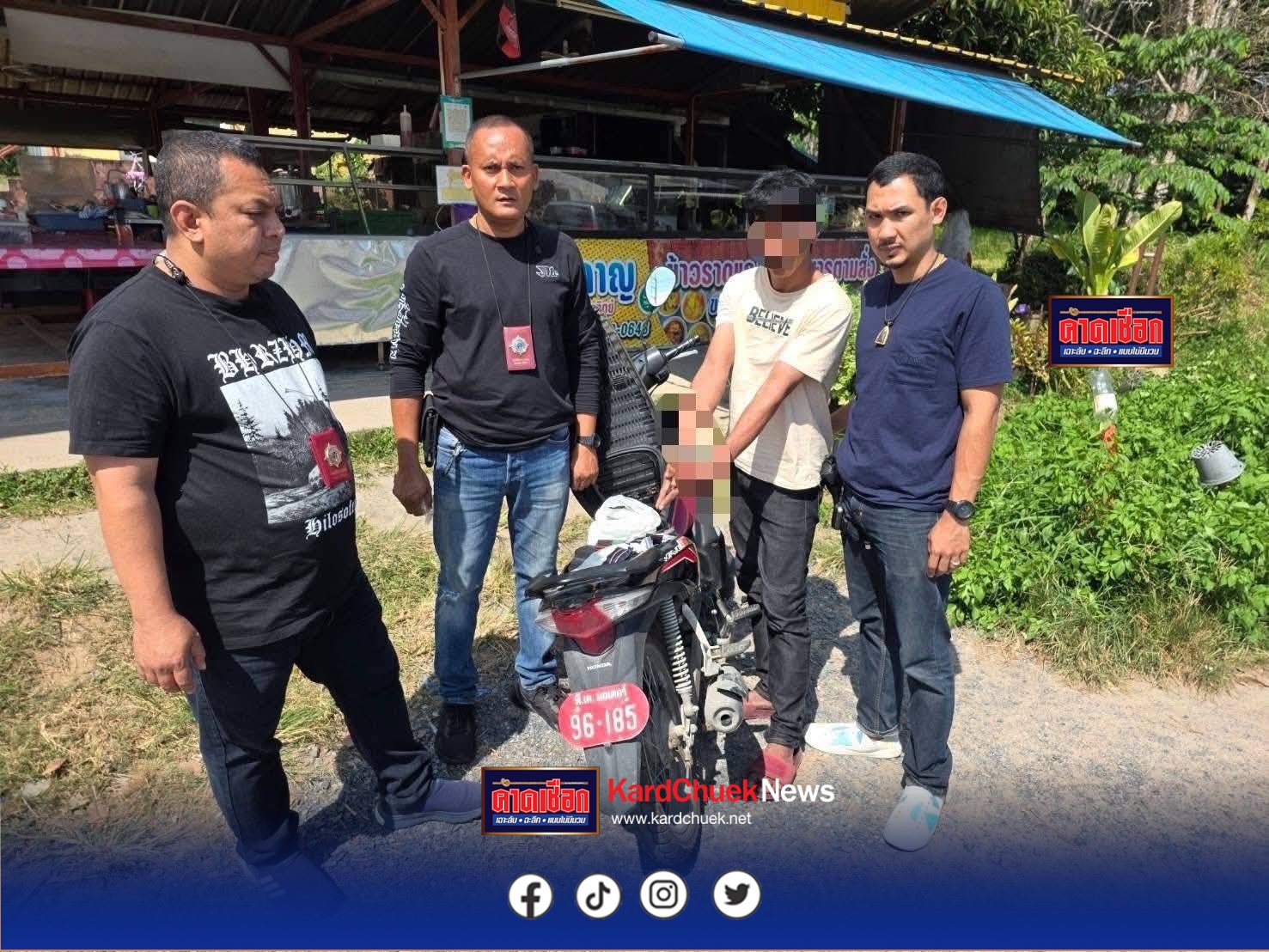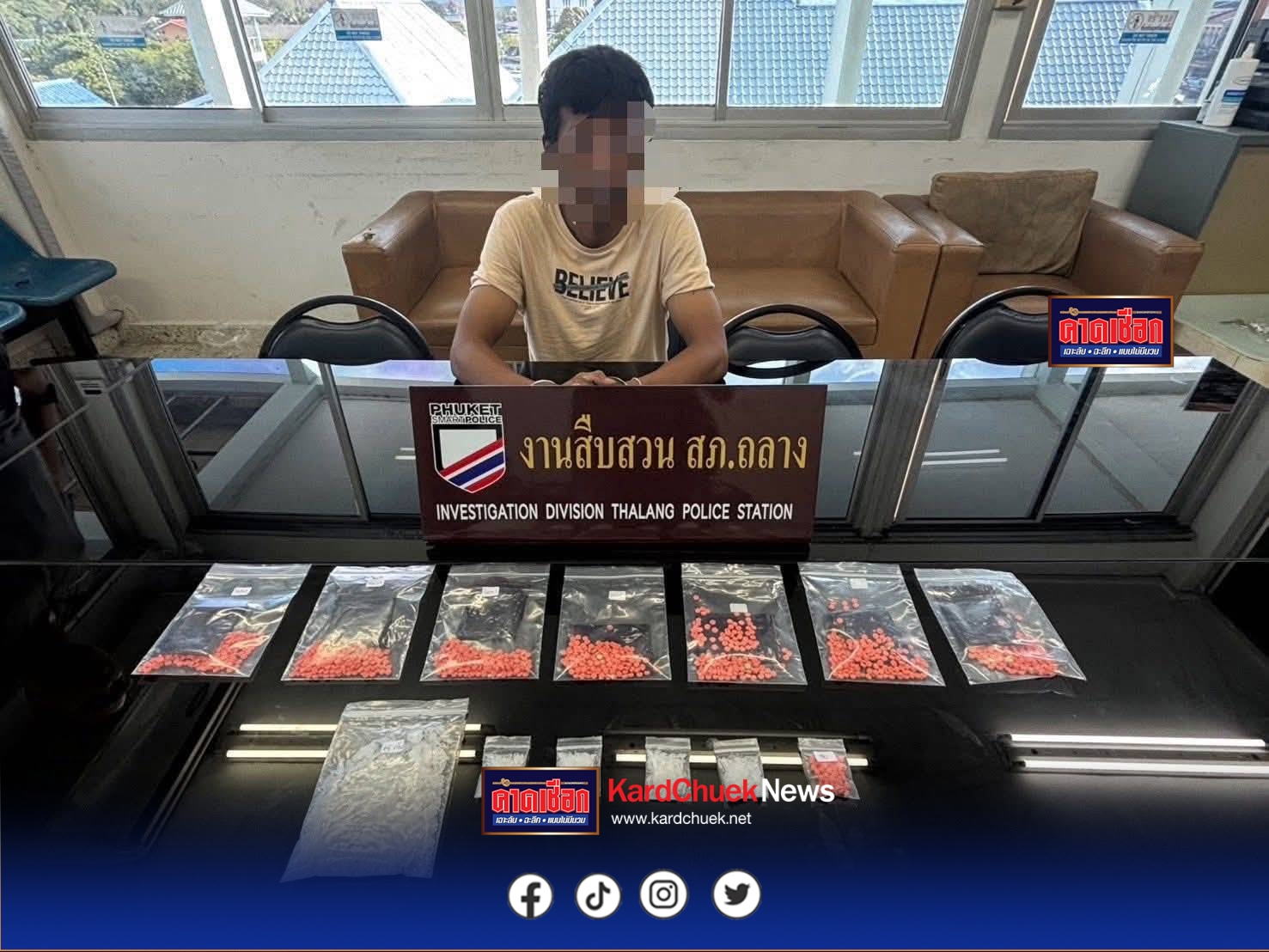 วันนี้ (1ธ.ค.) ภายใต้การอำนวยการของ พล.ต.ต.สินเลิศ สุขุม ผบก.ภ.จว.ภูเก็ต พ.ต.อ.อกนิษฐ์ ด่านพิทักษ์ศาสตร์ รองผบก.ภ.จว.ภูเก็ต พ.ต.อ.นิกร ชูทองผกก.สภ.ถลาง พ.ต.ท.ปรีชา บาริงพัฒนกูล รอง ผกก.สส.สภ.ถลาง นำโดย พ.ต.ท.สุชาติ ลือชา สว.สส.สภ.ถลาง และเป็นเจ้าพนักงาน ปปส.ฯ และชุดสืบสวนสภ.ถลาง สามารถจับกุมผู้ต้องหาคดียเสพติด 2 ราย รายที่ 1 นายอ๊อฟ อายุ 34 ปี พร้อมด้วยของกลาง ยาบ้า จำนวน 5 เม็ด จับได้ที่บริเวณหน้าร้านอาหารริมถนนศรีสุนทร ม.5 ต.ศรีสุนทร อ.ถลาง จ.ภูเก็ต แข้งข้อกล่าวหาว่า“ มียาเสพติดให้โทษประเภท 1 (ยาบ้า) ไว้ในความครอบครองโดยไม่ได้รับอนุญาต”