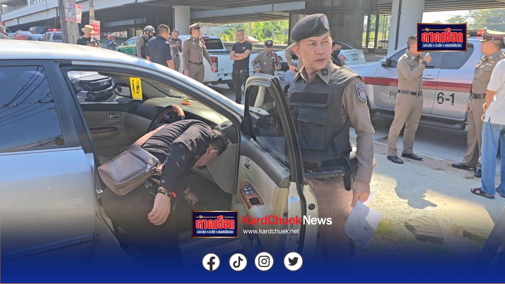 ด้าน พ.ต.อ.พฤฒ จำรูญศาสน์ ผกก.สภ.บางบัวทอง กล่าวว่า เบื้องต้นหลังได้รับแจ้งเหตุ เจ้าหน้าที่ตำรวจได้เดินทางไปที่เกิดเหตุ โดยผู้ก่อเหตุได้ยืนรอมอบตัวพร้อมด้วยของกลางอาวุธปืนพกสั้น ขนาด 9 มม. จึงได้เข้าควบคุมตัว มาที่สภ.บางบัวทอง เพื่อสอบปากคำ โดยเบื้องต้นแจ้ง 3 ข้อหา 1.พยายามฆ่า 2.พกพาอาวุธปืนในที่สาธารณะ 3.ยิงปืนในที่สาธารณะ จากการตรวจสอบพบว่าปืนมีทะเบียน แต่ผู้ก่อเหตุไม่มีใบอนุญาตพกพา จึงได้นำตัวดำเนินคดีตามกฎหมา