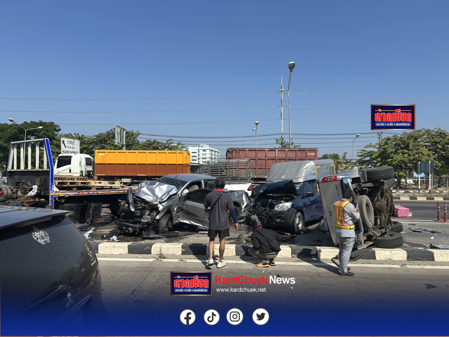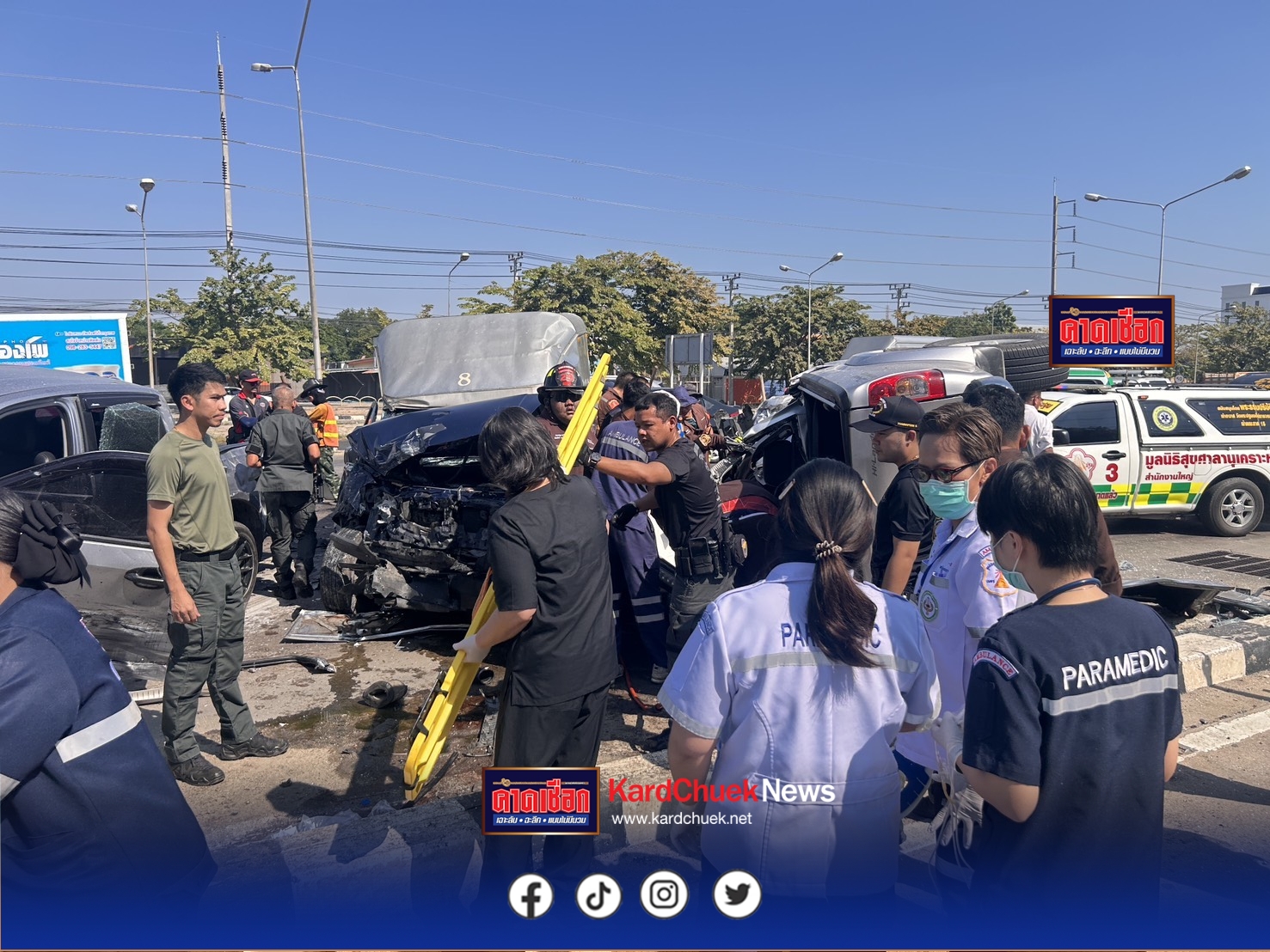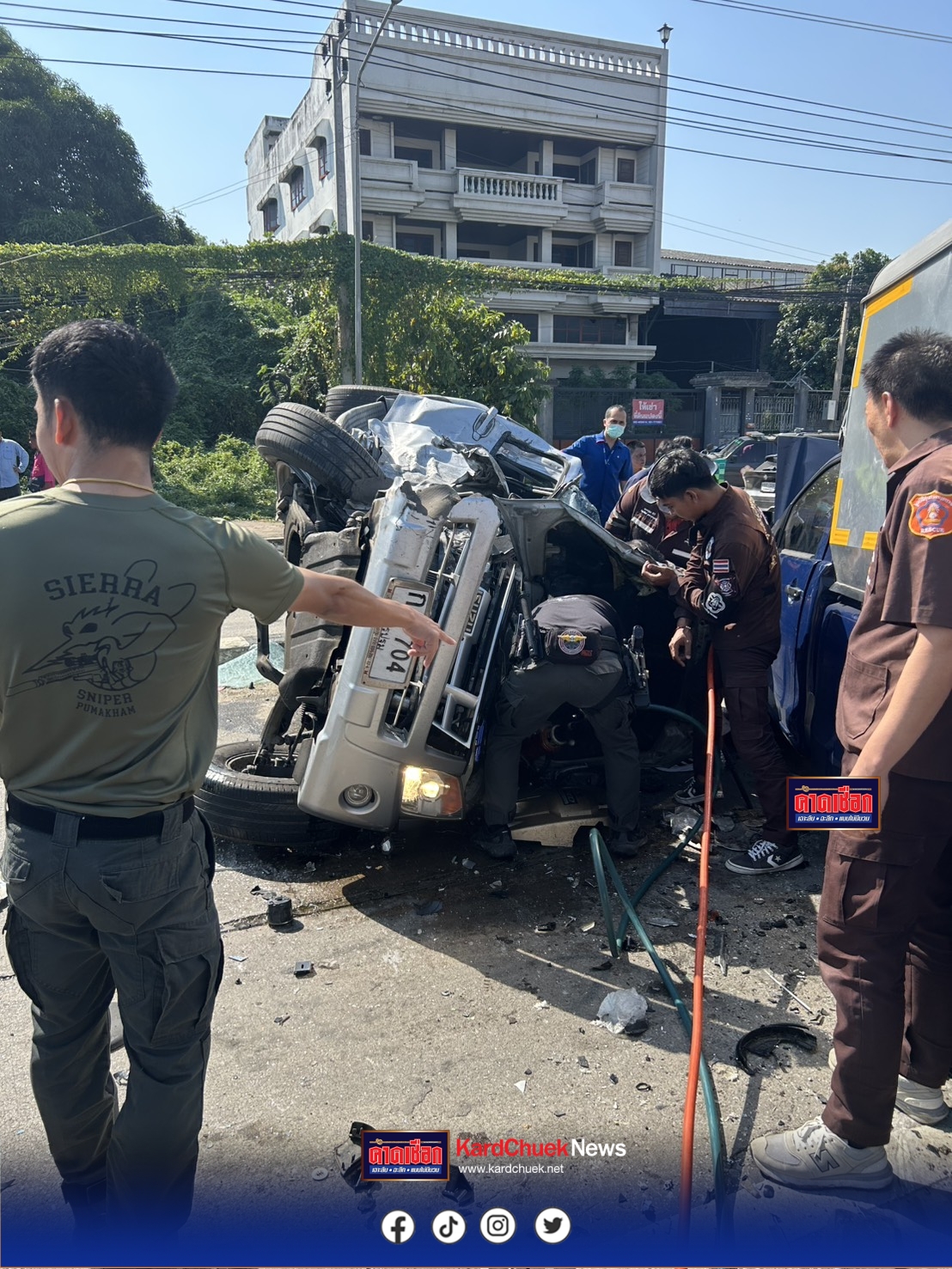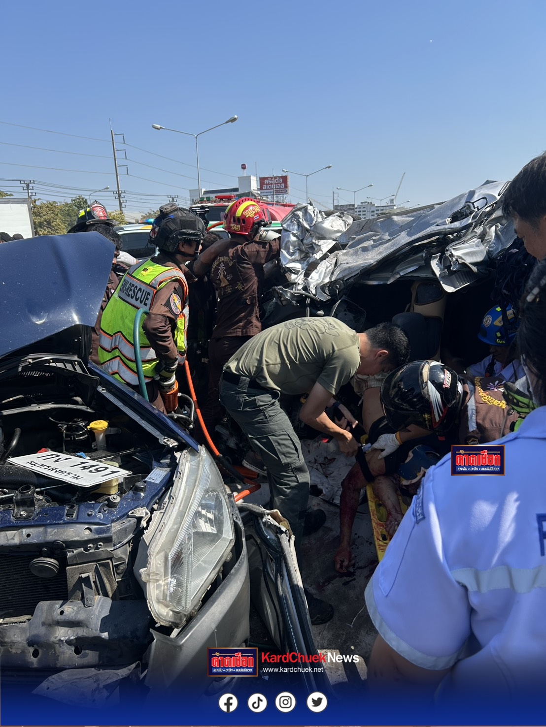 หน่วยปฏิบัติการพิเศษ (นปพ.) ภ.จว.นครปฐม รุดช่วยหน่วยงานเร่งเคลียร์พื้นที่ อุบัติเหตุสยองเพชรเกษมขาออก รถพ่วงชนซ้ำกระบะ 3 คัน ดับ 2 เจ็บ 2