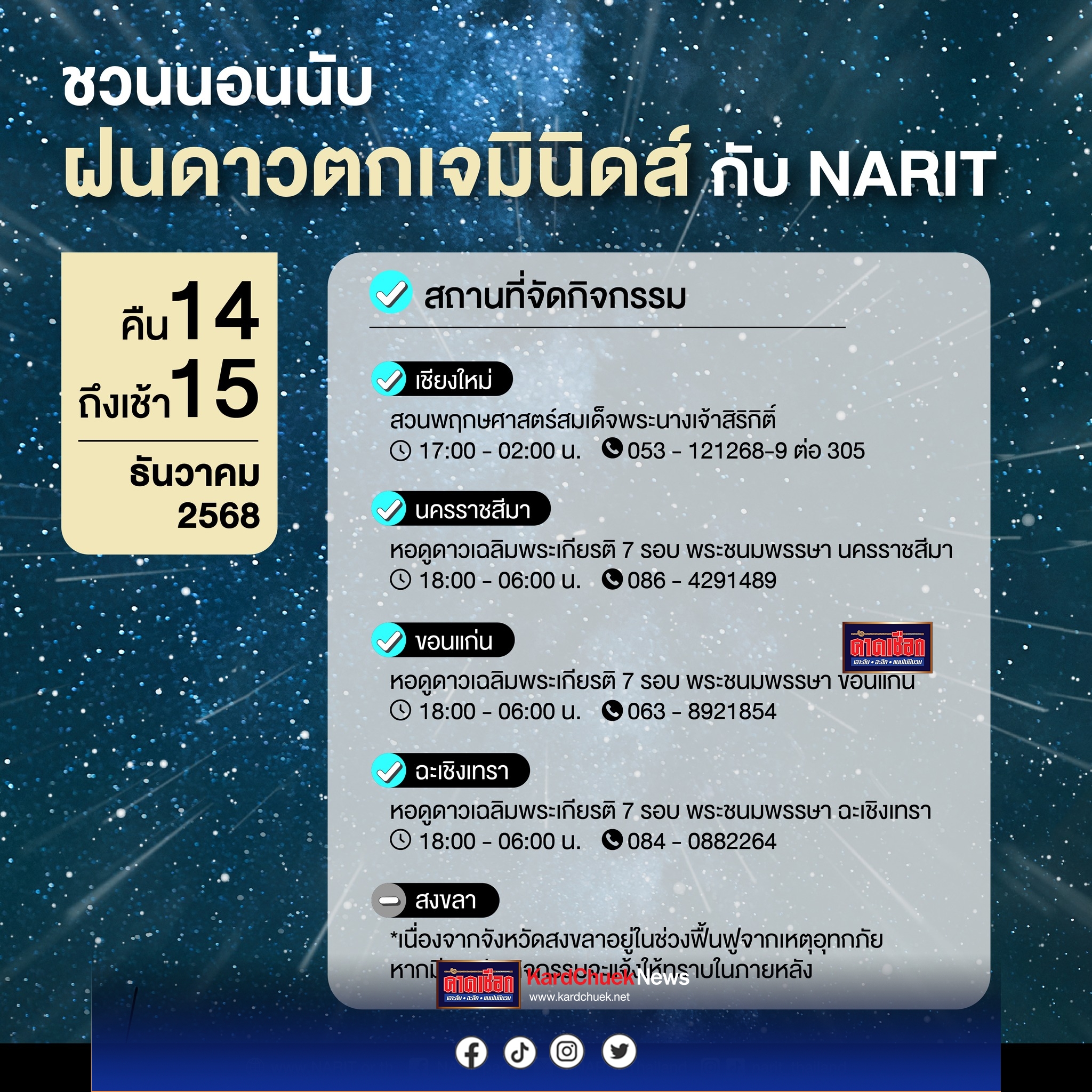 สดร. เตรียมจัดกิจกรรมสังเกตการณ์ “ฝนดาวตกเจมินิดส์” คืนวันที่ 14 ถึง รุ่งเช้า 15 ธันวาคม 2568 เชิญชวนผู้สนใจเข้าร่วมกิจกรรม ณ จุดสังเกตการณ์หลัก 4 แห่ง ดังนี้