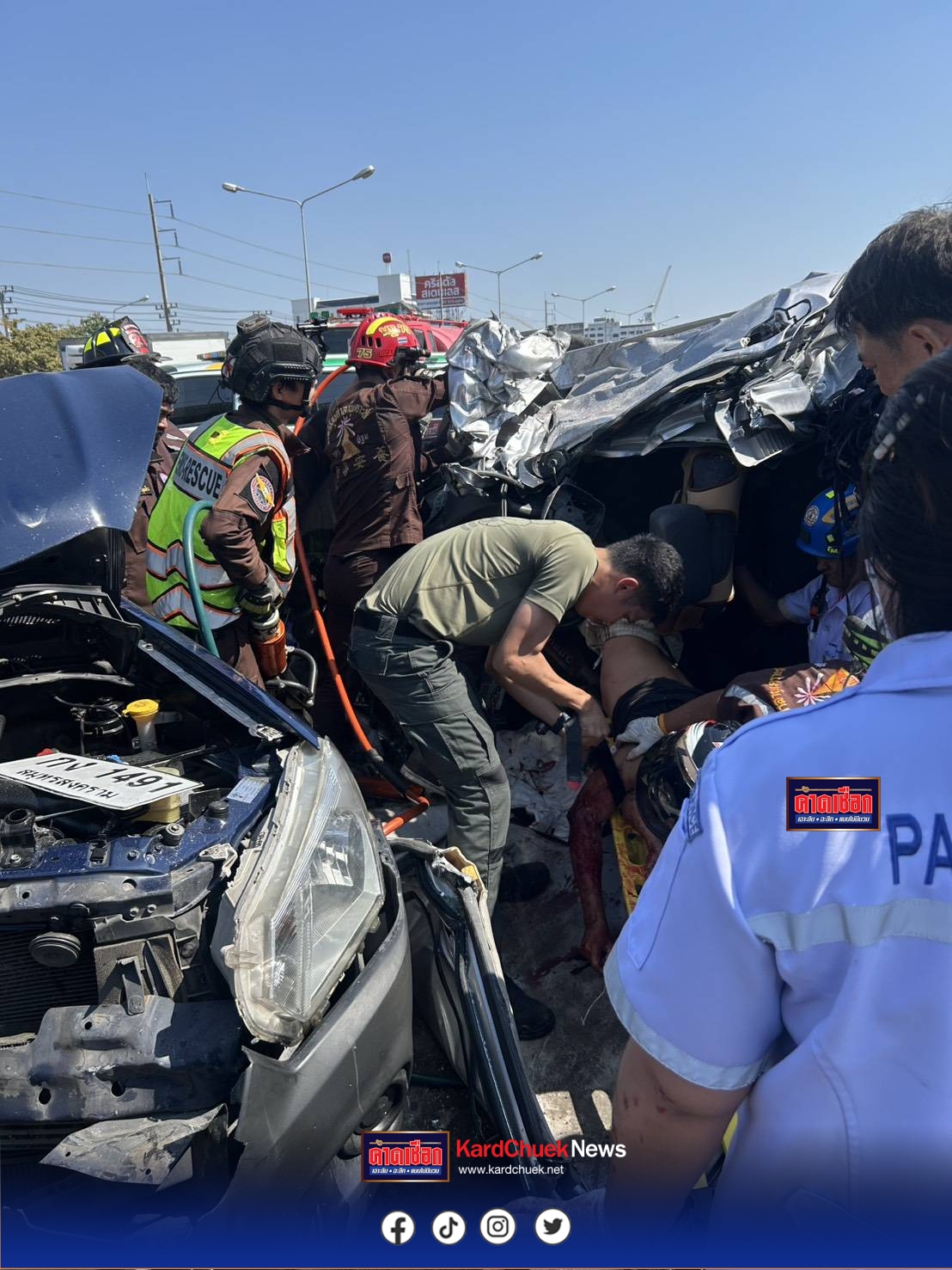 นปพ.นครปฐม ใช้ทักษะปฐมพยาบาลเผชิญเหตุบรรทุกพ่วงข้ามเกาะกวาดรถกระบะชาวบ้าน 3 คัน ตาย 2 เจ็บ 2