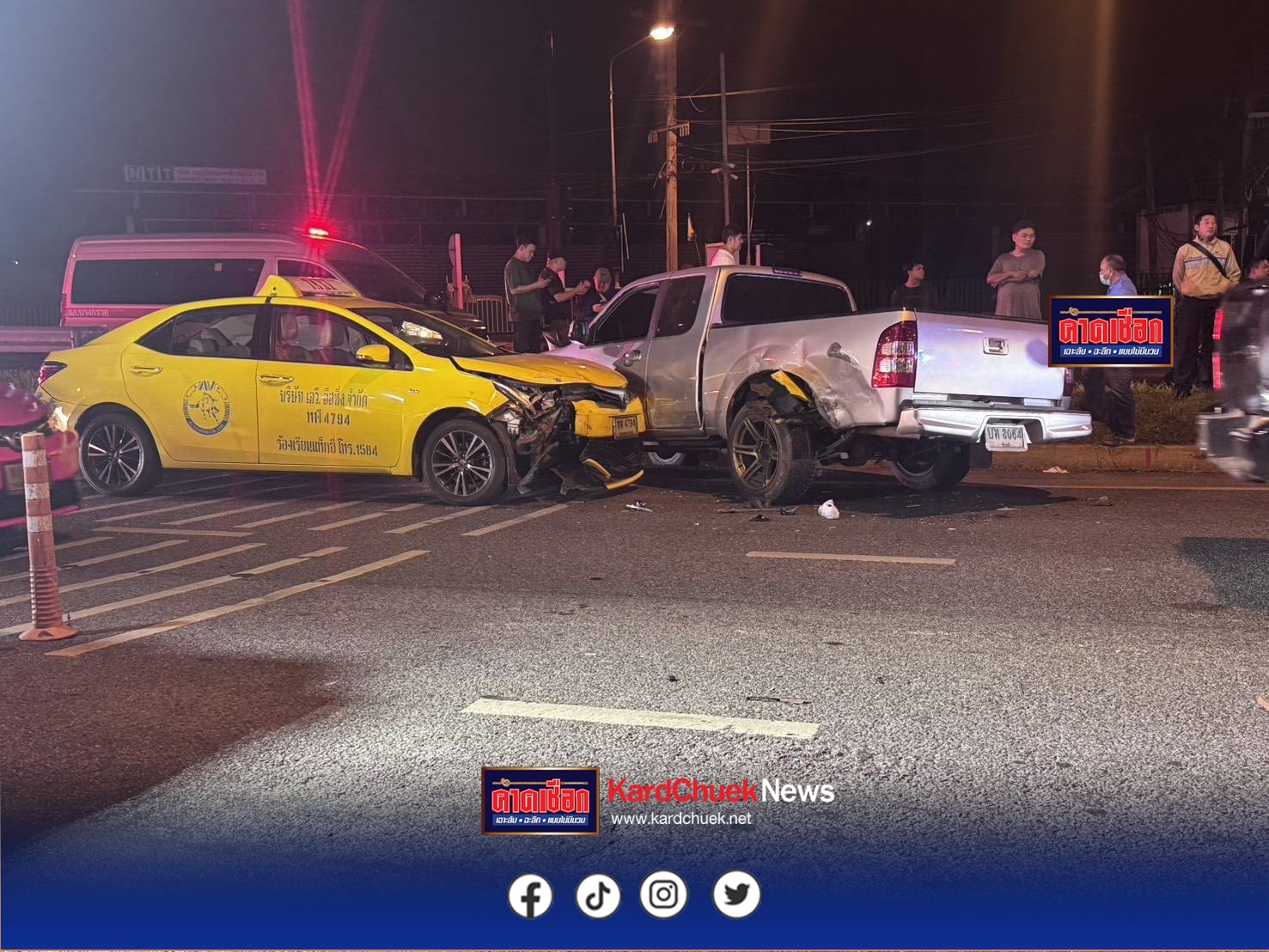 ถัดมาบริเวณเลนซ้ายของช่องทางด่วนพบรถแท็กซี่ สีเหลือง หมายเลขทะเบียน ทฬ 4794 กทม. พุ่งชนกับรถกระบะ ยี่ห้อฟอร์ด สีบรอนซ์ หมายเลขทะเบียน บท 8064 ชัยภูมิ ที่หักหลบรถจยย.ของผู้เสียชีวิต สภาพด้านหน้ารถพังยับทั้ง 2 คัน ห่างไปประมาณ 50 เมตร พบรถกระบะตู้ทึบ ยี่ห้ออีซูซุ รุ่นดีแมกซ์สีดำ หมายเลขทะเบียน บต 2367 กทม. บริเวณด้านหน้ารถมีร่องรอยเฉี่ยวชน ป้ายทะเบียนหลุด ด้านคนขับรถยนต์ทั้ง 3 คัน ได้ยืนรอให้การกับเจ้าหน้าที่ตำรวจอยู่ในที่เกิดเหตุ ซึ่งต่อมาภรรยาและญาติของผู้เสียชีวิตได้เดินทางมาที่เกิดเหตุด้วยอาการโศกเศร้าเสียใจ และไม่สะดวกให้สัมภาษณ์