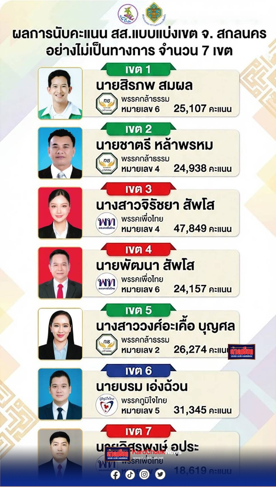 ผลการเลือกตั้ง ส.ส.สกลนคร วันที่ 8 ก.พ.2569 พรรค กธ.ปุกธงได้ 3 ที่นั่ง ขณะที่ พท.ได้ 3 ที่นั่ง ภท.1 ที่นั่ง พ่อลูกเขต 1-2 ตกคู่ ส่วนพ่อลูกเขต 3-4 ฉลุย