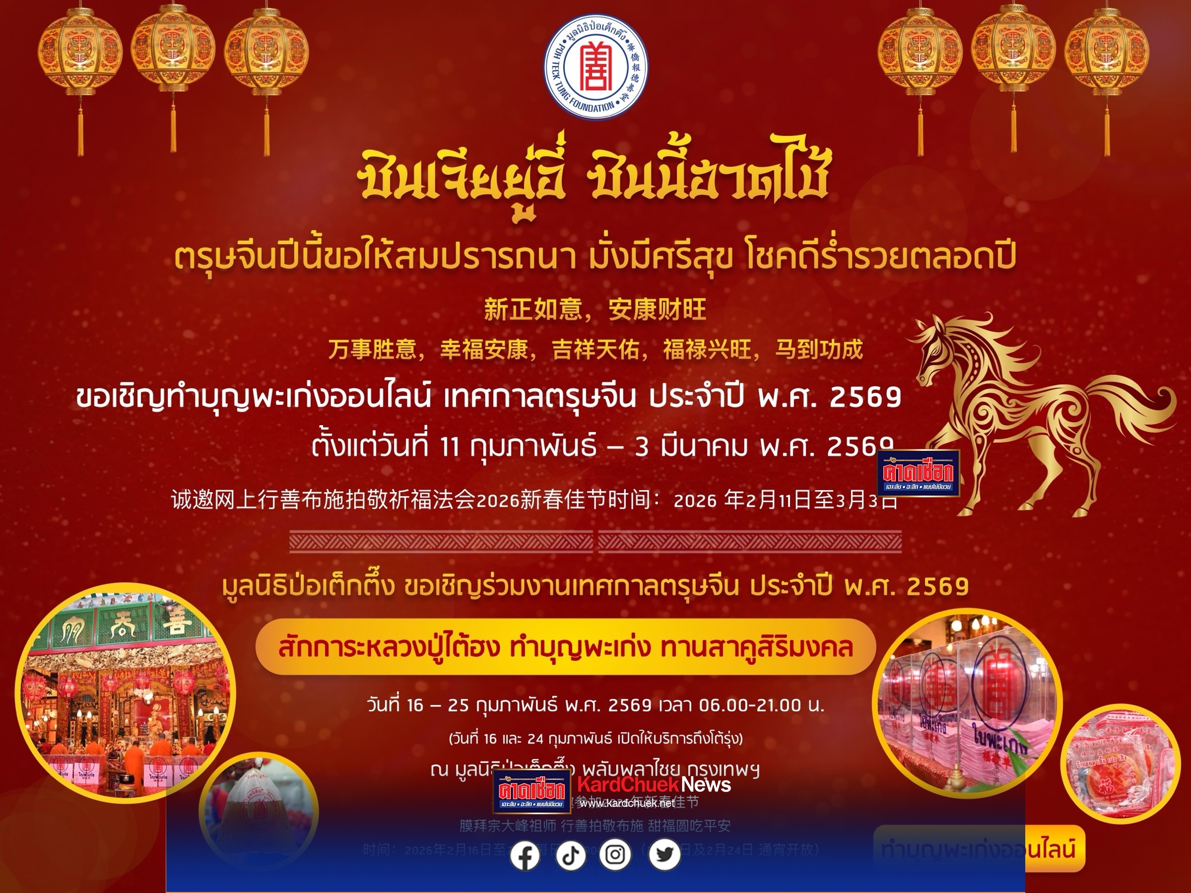 ระหว่างวันที่ 16 – 25 กุมภาพันธ์ พ.ศ. 2569 มูลนิธิป่อเต็กตึ๊ง โดย นายวิเชียร เตชะไพบูลย์ ประธานกรรมการ ขอเชิญศิษยานุศิษย์ และสาธุชนทุกท่าน ร่วม “สักการะหลวงปู่ไต้ฮง” ขอพรเนื่องในเทศกาลตรุษจีน ลงชื่อ สวดชัยมงคลคาถา หรือ “พะเก่ง” เพื่อความเป็นสิริมงคลตลอดปี เป็นพิธีมหามงคลใหญ่ 1 ปีมีเพียงครั้งเดียว ที่เปิดให้ทุกท่านได้เลือกทำบุญพะเก่งๆ ละ 20 บาทตามแต่ประสงค์ ประกอบด้วย ขอให้ครอบครัวมีสุข (แกหมึ่งเก่ง) , สะเดาะเคราะห์ (ปออุ่งเก่ง) , เสริมโชคลาภ (คิ่วไฉ่เก่ง) , เสริมดวงชะตา (ส่วยกุงเก่ง) , เสริมความมั่นคงสถาพร (กึงกีเก่ง) รวมถึงทำบุญสะเดาะเคราะห์และเสริมความเป็นสิริมงคลกับรูปปั้นนักษัตรปีมะเมีย รับประทาน “สาคูสิริมงคล” เพื่อความกลมเกลียวและอยู่เย็นเป็นสุข อัญเชิญ “ฮู้แดง” (ยันต์) ของหลวงปู่ไต้ฮง เพื่อนำไปประทับหน้าบ้าน เคหะสถาน หรือพกติดตัวเพื่อคุ้มครอง “เคาะระฆังทอง” ให้ก้องกังวานเพื่อให้ชีวิตสดใส การงานรุ่งเรืองระบือไกล และ ร่วม “พิธีเวียนธูปศักดิ์สิทธิ์” เพื่อขอพรเทพยดาฟ้าดินเนื่องในวันประสูติ (ทีกงแซ) ซึ่งในปีนี้ตรงกับวันอังคารที่ 24 กุมภาพันธ์ 2569 ขออำนาจฟ้าดินเป็นที่พึ่ง ขอให้สิ่งศักดิ์สิทธิ์ที่ตนนับถือ เช่น หลวงปู่ไต้ฮง ช่วยดลบันดาลให้ประสบโชคดีตลอดปีใหม่ (โดยในวันที่ 16 และ 24 กุมภาพันธ์ 2569 มูลนิธิป่อเต็กตึ๊ง เปิดบริการโต้รุ่ง)
