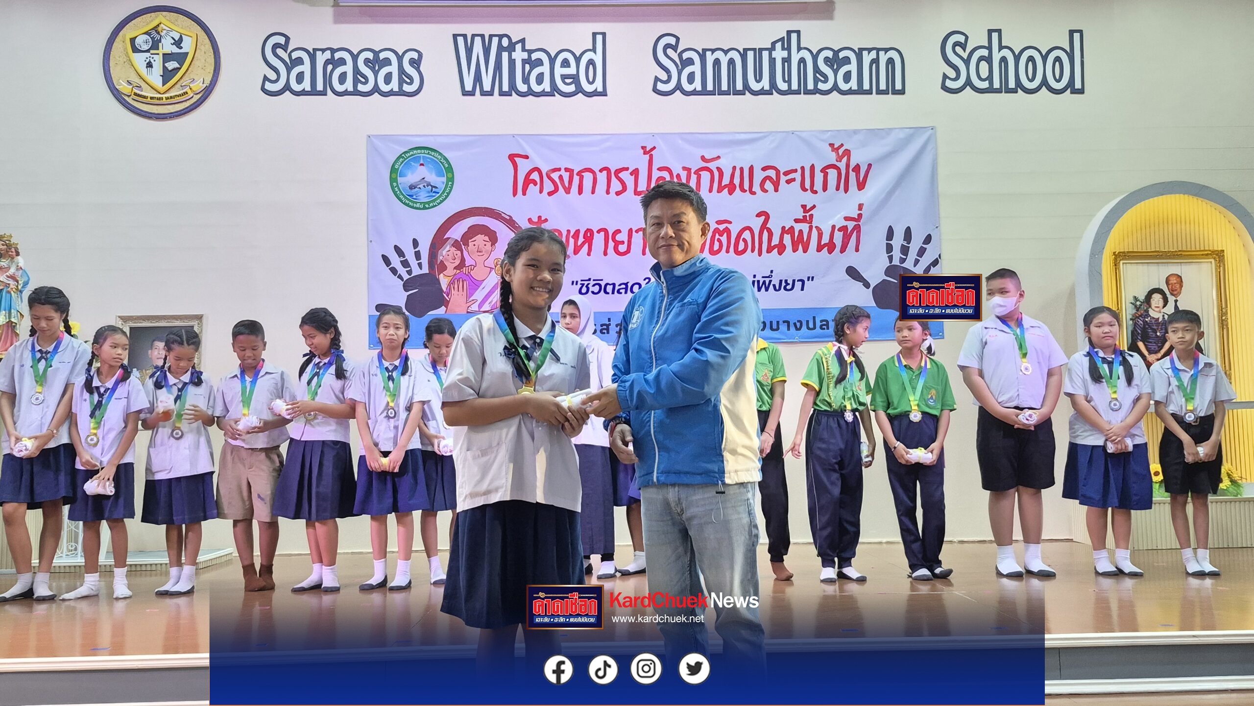 เมื่อเวลา 09.00 น.วันที่ 11 ก.พ.69 ที่ห้องประชุมใหญ่ภายในโรงเรียนสารสาสน์วิเทศน์สมุทรสาร หมู่ที่ 9 ต.ในคลองบางปลากด อ.พระสมุทรเจดีย์ จ.สมุทรปราการ พ.ต.อ.พจนกร กัญจินะ ผกก.สภ.พระสมุทรเจดีย์ นาย หนึ่งสกล ธเนศตระกูล นายก อบต.ในคลองบางปลากด ร่วมกันเป็นประธานในพิธี ปิดโครงการ การศึกษาเพื่อต่อต้านการใช้ยาเสพติดในเด็กนักเรียน DRUG ABUSE RESISTANCE EDUCATION ( D.A.R.E. ประเทศไทย) มี พ.ต.ท..กิตติกานด์ กองเศรษฐ์ สวป.(ชมส.)สภ.พระสมุทรเจดีย์ กล่าวรายงาน โดยมี นาย ภูวกฤต คล้ายเจริญสุข กต.ตร.สภ.พระสมุทรเจดีย์ ดร.ณพวัศกช์ เดชชาตรี ปลัด อบต.สมาชิกสภา อบต.ในคลองบางปลากด คณะทำงานฯ ครู อาจารย์และนักเรียน เข้าร่วมกิจกรรม