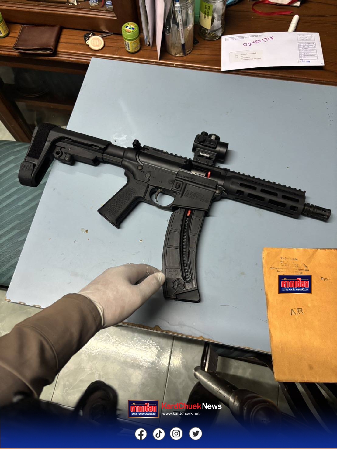 พร้อมด้วยของกลาง 1.อาวุธปืนยาว ชนิด เดี่ยวลูกรด ขนาด.22 ยี่ห้อ สมิทแอนด์เวทสัน หมายเลขทะเบียน สท04/6450045 จำนวน 1 กระบอกแม๊กกาซีนจำนวน 2 อัน