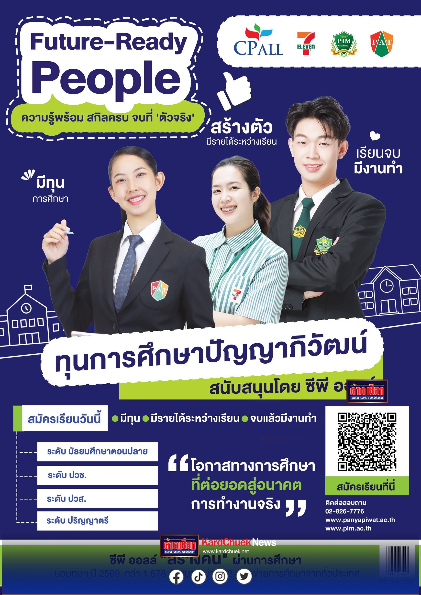 บริษัท ซีพี ออลล์ จำกัด (มหาชน) ผู้บริหารเซเว่น อีเลฟเว่น และเซเว่น เดลิเวอรี่ เดินหน้าสร้าง “คนเก่ง คนดี” อย่างยั่งยืน จับมือสถาบันการจัดการปัญญาภิวัฒน์ (PIM) วิทยาลัยเทคโนโลยีปัญญาภิวัฒน์ (PAT) และเครือข่ายการศึกษา สนับสนุน “ทุนการศึกษา” ภายใต้แนวคิด Future-Ready People มุ่งพัฒนาคนรุ่นใหม่ให้ “พร้อมใช้จริง” ในโลกการทำงาน