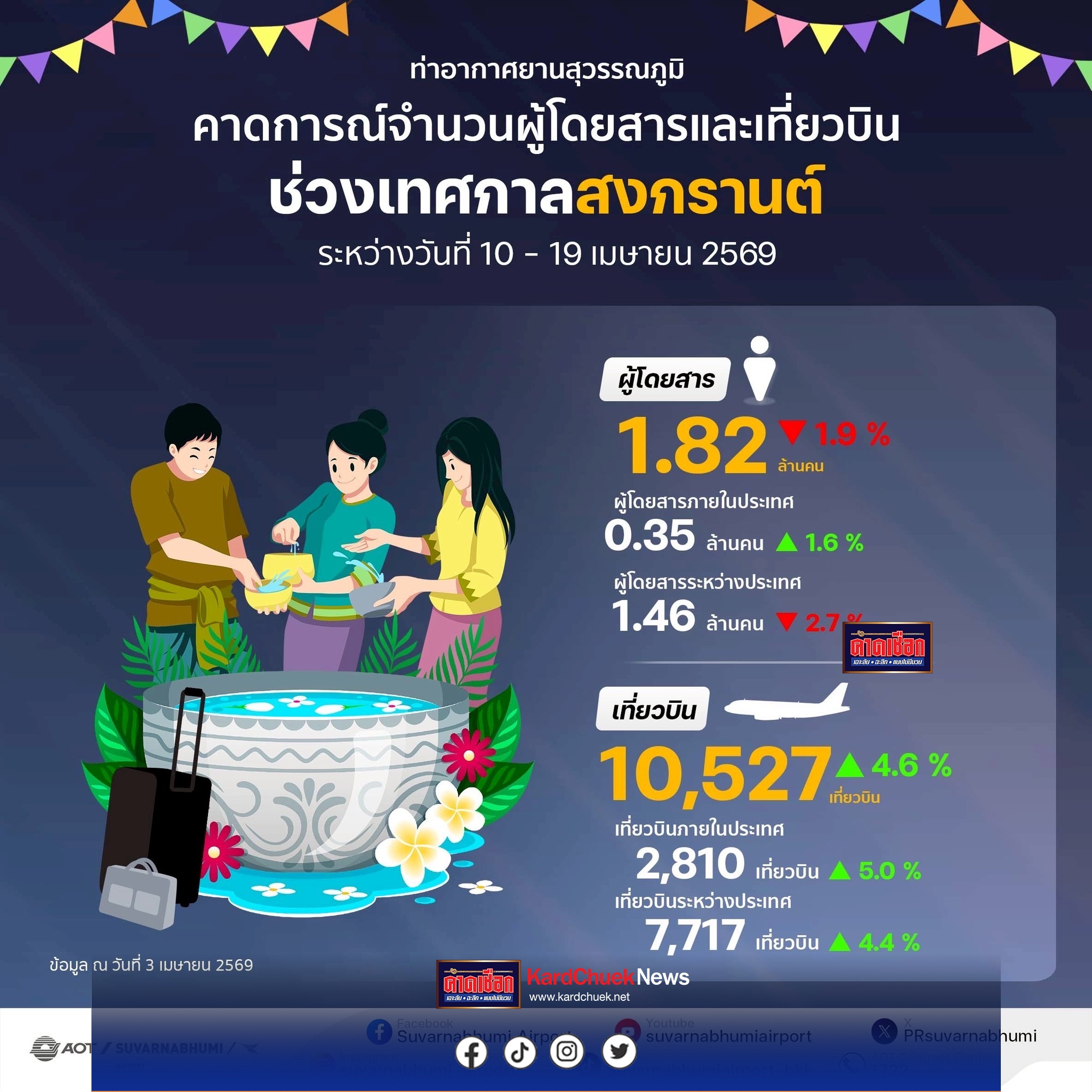 *****เมื่อวันที่ 8 เมษายน 2569นายกิตติพงศ์ กิตติขจร ผู้อำนวยการท่าอากาศยานสุวรรณภูมิ บริษัท ท่าอากาศยานไทย จำกัด (มหาชน) เปิดเผยว่า ในช่วงเทศกาลสงกรานต์ประจำปี 2569 นี้ ทสภ. คาดการณ์จำนวนผู้โดยสารในภาพรวมที่เดินทางผ่าน ทสภ. ระหว่างวันที่ 10 – 19 เมษายน 2569 (รวม 10 วัน) ประมาณ 1,820,000 คน หรือเฉลี่ยวันละประมาณ 182,000 คน ลดลงจากปีที่ผ่านมาในช่วงเวลาเดียวกันร้อยละ 1.9 สำหรับประมาณการเที่ยวบินในช่วงดังกล่าวคาดว่าจะมีเที่ยวบินประมาณ 11,000 เที่ยวบิน เฉลี่ยวันละ 1,100 เที่ยวบิน เพิ่มขึ้นจากปีที่ผ่านมาในช่วงเวลาเดียวกันร้อยละ 4.6