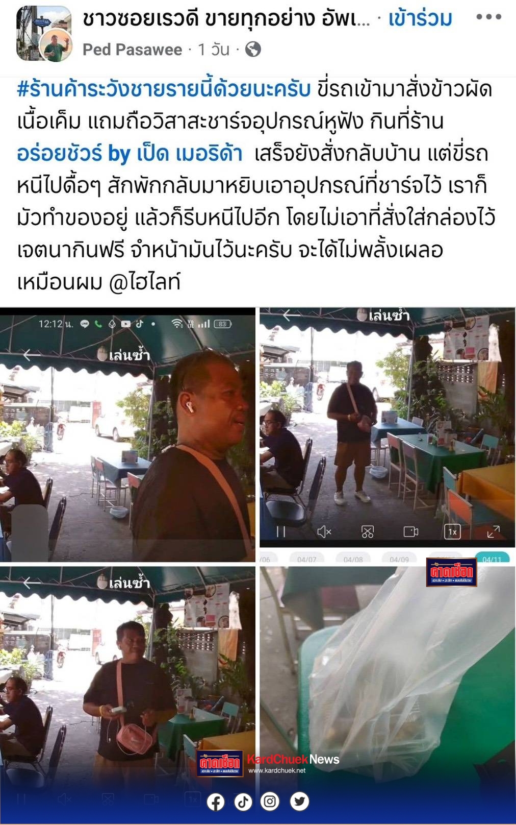 จากกรณีผู้ใช้เฟซบุ๊กรายหนึ่งได้โพสต์คลิปจากกล้องวงจรปิดลงในกลุ่ม “ชาวซอยเรวดี ขายทุกอย่าง” เพื่อประกาศเตือนภัยและตามหาชายรายหนึ่งที่เข้ามาสั่งอาหารแล้วไม่ยอมจ่ายเงิน โดยระบุข้อความเตือนพ่อค้าแม่ค้าว่า “ร้านค้าระวังชายรายนี้ด้วยนะครับ ขี่รถเข้ามาสั่งข้าวผัดเนื้อเค็ม แถมถือวิสาสะชาร์จอุปกรณ์หูฟัง กินที่ร้านอร่อยชัวร์ by เป็ด เมอริด้า เสร็จยังสั่งกลับบ้าน แต่ขี่รถหนีไปดื้อๆ สักพักกลับมาหยิบเอาอุปกรณ์ที่ชาร์จไว้ เราก็มัวทำของอยู่ แล้วก็รีบหนีไปอีก โดยไม่เอาที่สั่งใส่กล่องไว้ เจตนากินฟรี จำหน้ามันไว้นะครับ จะได้ไม่พลั้งเผลอเหมือนผม”