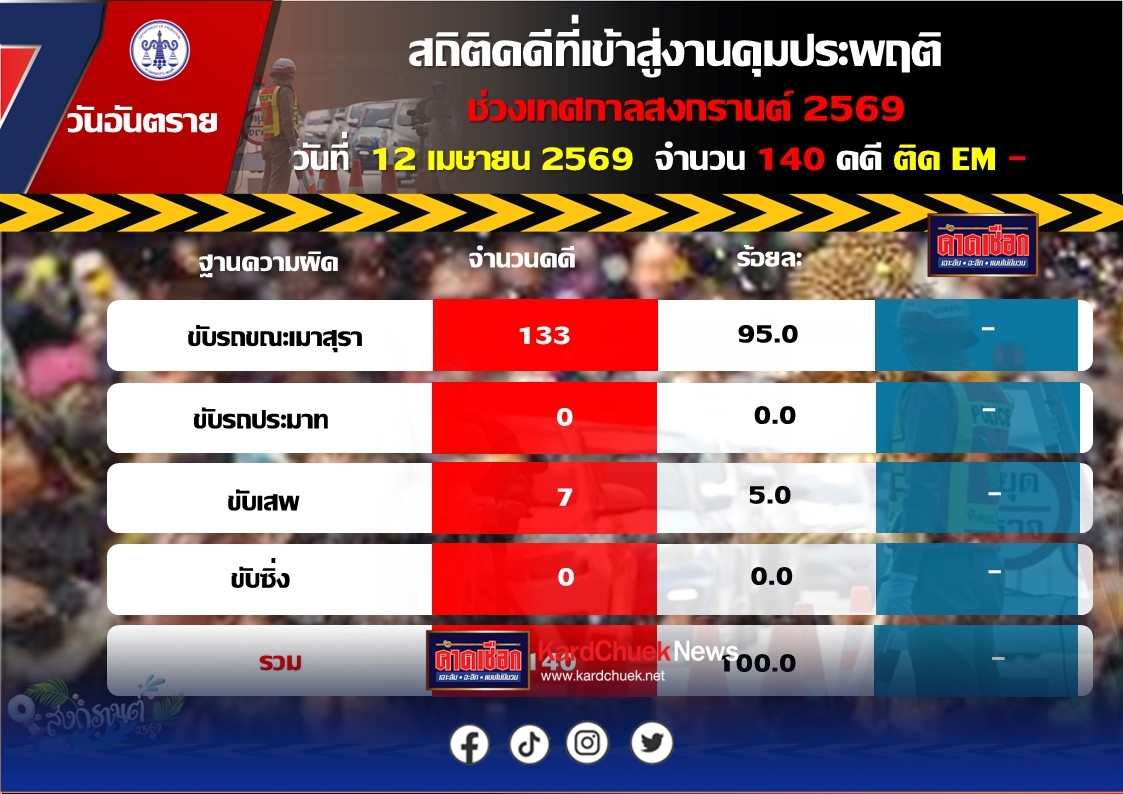วันนี้ 13 เมษายน 2569 ร.ต.อ .ปิยะ รักสกุล อธิบดีกรมคุมประพฤติ เปิดเผยสถิติคดีที่ศาลสั่งคุมความประพฤติในวันที่ 12 เมษายน 2569 ว่า”เนื่องจากศาลปิดทำการในหลายพื้นที่ จึงมีคดีเข้าสู่กระบวนการคุมความประพฤติรวมทั้งสิ้น เพียง 140 คดี แบ่งเป็น คดีขับรถในขณะเมาสุรา 133 คดี คิดเป็นร้อยละ 95 และคดีขับเสพ 7 คดี คิดเป็นร้อยละ 5 โดยมีสถิติคดีสะสมช่วง 3 วัน (10 – 12 เมษายน 2569) รวมทั้งสิ้น 1,750 คดี แบ่งเป็น คดีขับรถขณะเมาสุรา 1,613 คดี คิดเป็นร้อยละ 92.2 คดีขับเสพ 134 คดี คิดเป็นร้อยละ 7.6 และคดีขับรถประมาท 3 คดี คิดเป็นร้อยละ 0.2 สำหรับจังหวัดที่มีสถิติคดีขับรถขณะเมาสุราสูงสุด 3 อันดับแรกยังคงเดิม ได้แก่ เชียงใหม่ 246 คดี นนทบุรี 147 คดี และสมุทรปราการ 145 คดี”