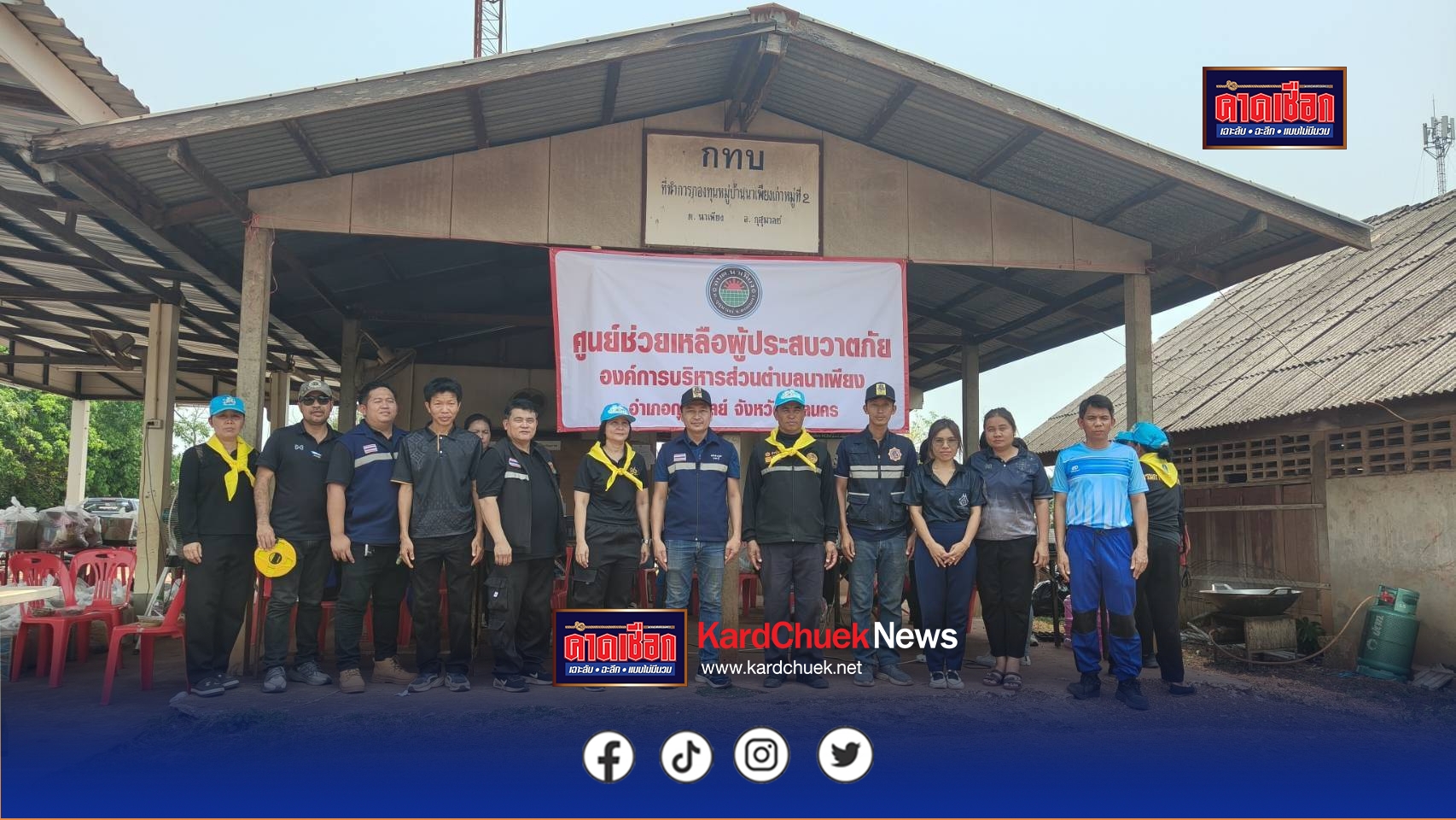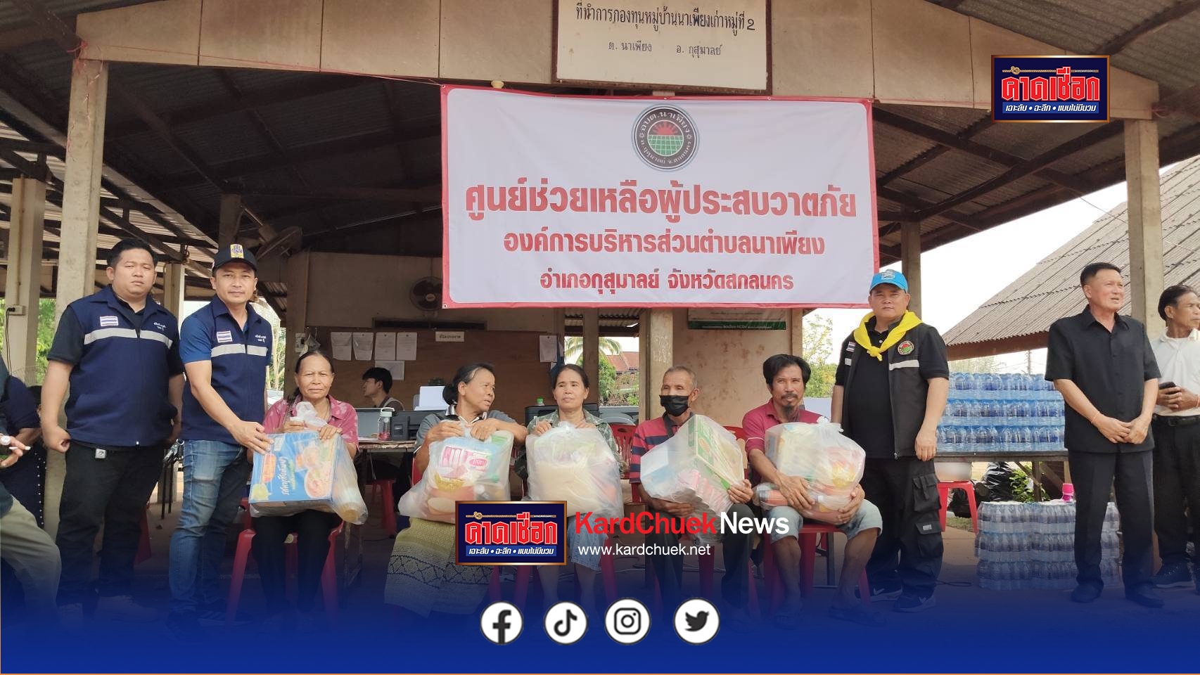 ต่มา วันที่ 18 เมษายน 2569 นายอภิชาติ ผานคำ นายก อบต.นาเพียง นำ จนท.ฝ่ายประชาสัมพันธ์ ออกประกาศเชิญชวนให้ผู้ที่ประสบภัยมาปจ้ง จนท.เพื่อลงทะเบียนความเสียหาย พร้อมนำข้าวสาร อาหารแห้ง ปลากระป๋อง มาม่า จัดเป็นถุงยังชีพเพื่อแจกจ่ายบรรเทาความเดือดร้อน ส่วนในระยะยาวจะให้เป็นไปตามระเยียบ ขณะที่นายปริญญา โคตรบรม อายุ 54 ปี