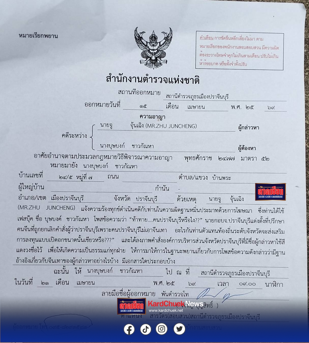 ล่าสุด นางบุษบงก์ ชาวกัณหา อายุ 59 ปี ข้าราชการบำนาญและอดีตอนุกรรมาธิการทรัพยากรน้ำ รัฐสภา /เป็นที่ปรึกษาของสมาชิกวุฒิสภาพื้นที่ จ.ปราจีนบุรี / ผู้ทรงคุณวุฒิคณะกรรมการบริหารงานจังหวัดบูรณาการ ได้โพสต์ภาพหมายเรียกพยานจาก สภ.เมืองปราจีนบุรี ลงพื้นที่เฟซบุ๊กส่วนตัว พร้อมระบุข้อความว่า … “มาแล้ว” โดยยืนยันว่าการตั้งคำถามในโซเชียลมีเดียเป็นไปเพื่อตรวจสอบความโปร่งใสในการบริหารราชการจังหวัด และมุ่งหวังประโยชน์สูงสุดของชาวปราจีนบุรี…