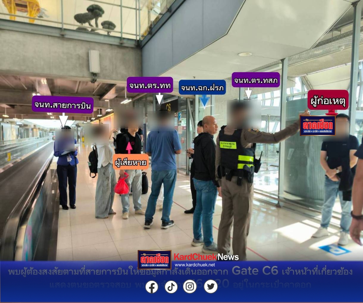 *****ทั้งนี้ภายหลังได้รับแจ้งเหตุดังกล่าว ศูนย์รักษาความปลอดภัยท่าอากาศยานสุวรรณภูมิ จึงได้ประสานเจ้าหน้าที่ชุดเฉพาะกิจฝ่ายรักษาความปลอดภัย ทสภ. (ฉก.ฝรภ.ทสภ.) และสถานีตำรวจภูธรท่าอากาศยานสุวรรณภูมิ (สภ.ทสภ.) พร้อมด้วยกองกำกับการ 3 กองบังคับการตำรวจท่องเที่ยว 1 เข้าพื้นที่บริเวณหน้า Gate C6 เพื่อเข้าตรวจสอบเหตุการณ์ดังกล่าวทันทีเมื่ออากาศยานเดินทางถึง ทสภ. กระทั่งพบบุคคลต้องสงสัย จึงได้แสดงตัวเข้าทำการตรวจค้นและควบคุมตัว จากการตรวจค้นพบเงินสดจำนวน 16,020 บาท ซุกซ่อนอยู่ภายในกระเป๋าคาดอกสีดำของผู้ต้องสงสัย ซึ่งเป็นชายสัญชาติจีน อายุ 41 ปี ซึ่งโดยสารมากับเที่ยวบินเดียวกัน โดยผู้ต้องสงสัยให้การรับสารภาพว่าเป็นผู้ก่อเหตุจริง เจ้าหน้าที่จึงได้ควบคุมตัวส่งพนักงานสอบสวน สภ.ทสภ. เพื่อดำเนินคดีตามกฎหมายต่อไป