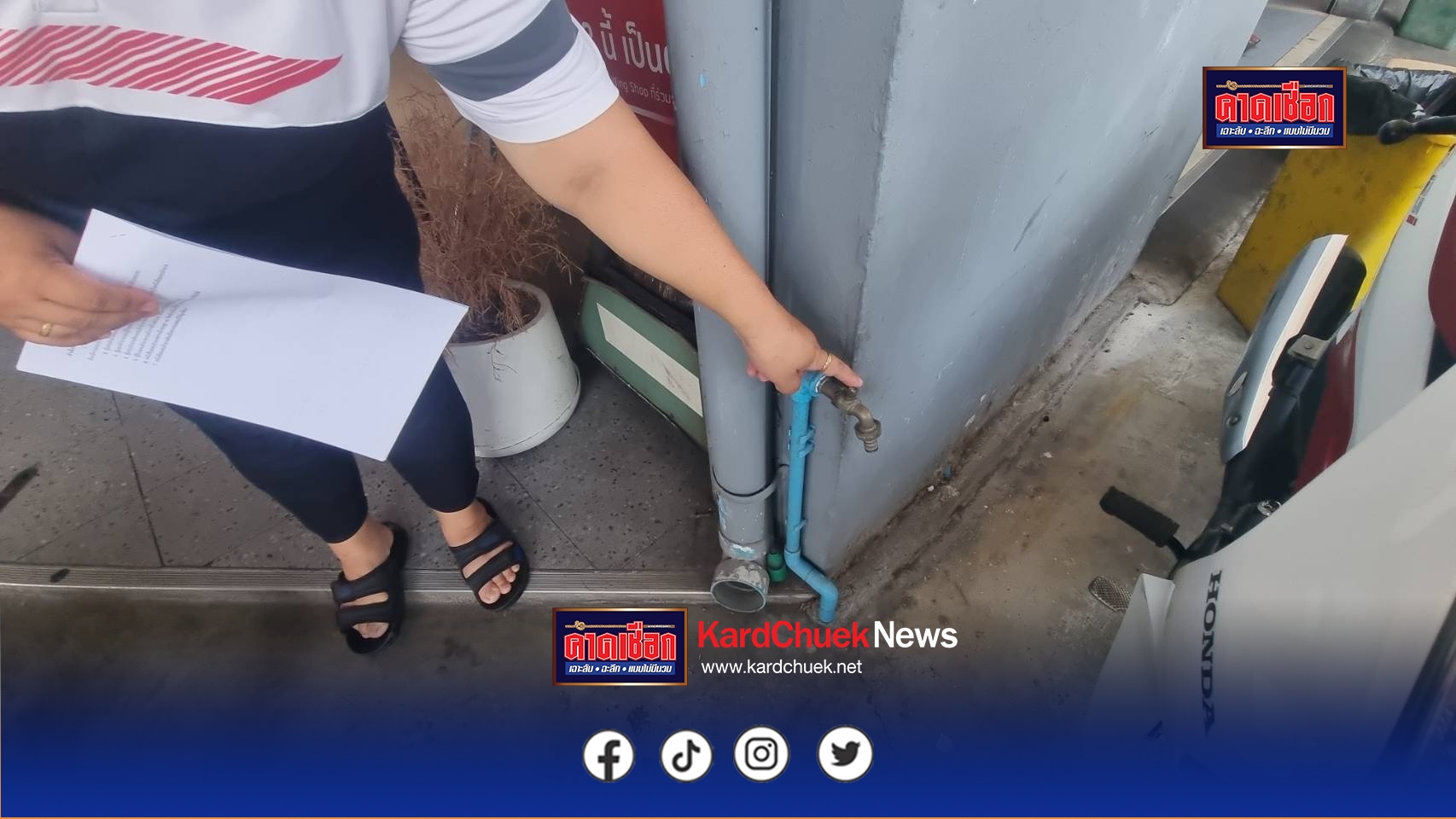 เมื่อวันที่ 22 เมษายน 69 ผู้สื่อข่าวลงพื้นที่ศูนย์บริการจำหน่ายรถแห่งหนึ่ง ถ.ติวานนท์ ต.ปากเกร็ด อ.ปากเกร็ด จ.นนทบุรี พบพี่นิว พนักงานของบริษัท กล่าวว่า ช่วงเช้าที่ผ่านมา ตนเข้ามาเปิดร้านแล้วสังเกตเห็นน้ำก๊อกน้ำที่หน้าร้านหยด ดูแล้วมันผิดสังเกตุ จึงได้เปิดกล้องวงจรปิดในร้านดู พบว่าช่วงเวลา 03.21น. ซึ่งเป็นช่วงเช้าของวันที่ 22 เมษายน ได้มีชายสวมเสื้อยืดสีดำ ใส่กางเกงขาสั้น ท่าทางกำลังเหมือนกับแบกท่อพีวีซี เดินตรงมาที่ก๊อกน้ำที่หน้าร้านแล้วมาดึงๆ งัดๆ ทีแรกนึกว่าเขาคงหิวน้ำหาน้ำกิน ดูดีๆแล้วไม่ใช่ น่าจะเป็นขโมย โชคยังดีที่เอาไปไม่ได้ ถ้าเอาไปได้น้ำคงท่วมนองหน้าร้านแน่นอน ส่วนร้านขายยางรถยนต์ที่ติดกับร้านตน เท่าที่ไปสอบถามมาก็พบว่าโดนขโมยหัวก๊อกน้ำไป 2 อัน คาดว่าคนร้ายเป็นคนเดียวกัน