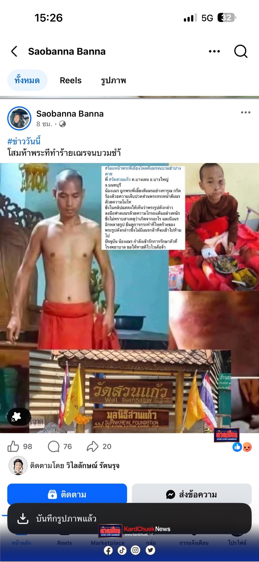 ความคืบหน้าล่าสุดเมื่อวันที่ 25 เม.ย. 2569 เวลา 15.00 น. ผู้สื่อข่าวได้ลงพื้นที่ไปยังวัดสวนแก้ว อ.บางใหญ่ จ.นนทบุรี เพื่อสอบถามข้อเท็จจริงจาก พระพยอม กัลยาโณ เจ้าอาวาสวัดสวนแก้ว ซึ่งได้ชี้แจงถึงกรณีดังกล่าวว่า จากการตรวจสอบข่าวที่เผยแพร่ พบว่าเป็นข่าวที่ไม่มีการระบุวัดต้นทางของเหตุการณ์อย่างชัดเจน ก่อนจะมีการนำไปบิดเบือนและสร้างเป็นข่าวปลอม โดยโยงว่าเป็นเหตุที่เกิดขึ้นภายในวัดสวนแก้ว ทั้งที่ในความเป็นจริง วัดสวนแก้วไม่เคยมีเหตุการณ์ลักษณะดังกล่าวเกิดขึ้นเลย อีกทั้งพระที่ปรากฏในภาพก็ไม่ใช่พระในวัด และภายในวัดก็ไม่มีสามเณรอยู่แม้แต่รูปเดียว