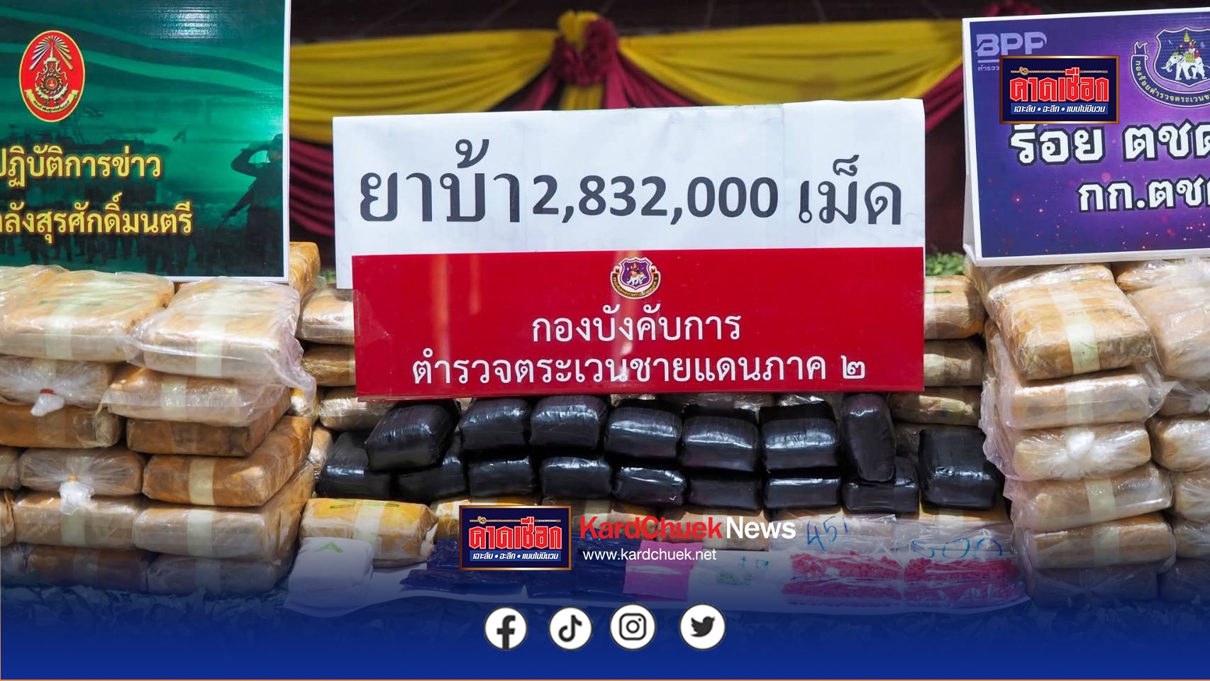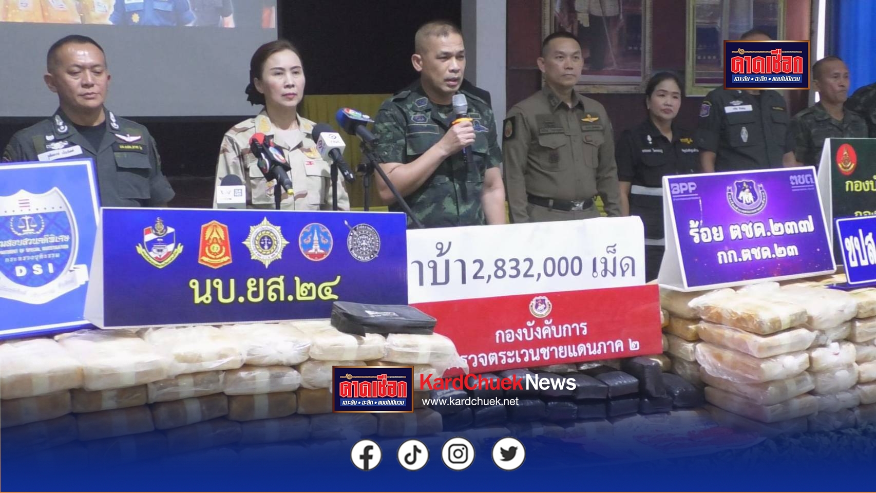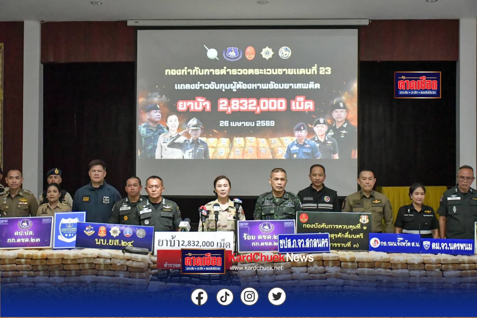 ในการแถลงข่าววันนี้ เวลา 11.30 น. 26 เม.ย.69 ที่ กก.ตชด.23 ค่ายศรีสกุลวงศ์ จ.สกลนคร นำโดย นางรณิดา เหลืองฐิติสกุล ผวจ.สกลนคร พลตรี จิตรกร จันทร์สว่าง ผบ.มทบ.29 และ พล.ต.ต.สุริเดช วรรทธิ์ ผบก.ภ.จว.สกลนคร พล.ต.ต.วุฒิพงษ์ เย็นจิตต์ ผบก.ตชด.ภาค 2 พ.ต.อ.ธีรศักดิ์ โพธิ์ศรีมา ผกก.ตชด.23 พ.ต.ท.เรวัฒ จำปาน ผบ.ร้อย ตชด.237 ตร.พฐ.สกลนคร ได้ร่วมกันยืนยันความสำเร็จในการตัดวงจรการค้าครั้งสำคัญนี้ โดยเบื้องต้นได้ตรวจยึดรถยนต์ฟอร์ด 4 ประตู สีดำ ทะเบียน ขจ 3888 อุดรธานี โทรศัพท์มือถือ 2 เครื่อง และส่งตัวผู้ต้องหาให้ สภ.วานรนิวาส ดำเนินคดีตามกฎหมายเพื่อสืบหาตัวนายทุนที่อยู่เบื้องหลังต่อไป.