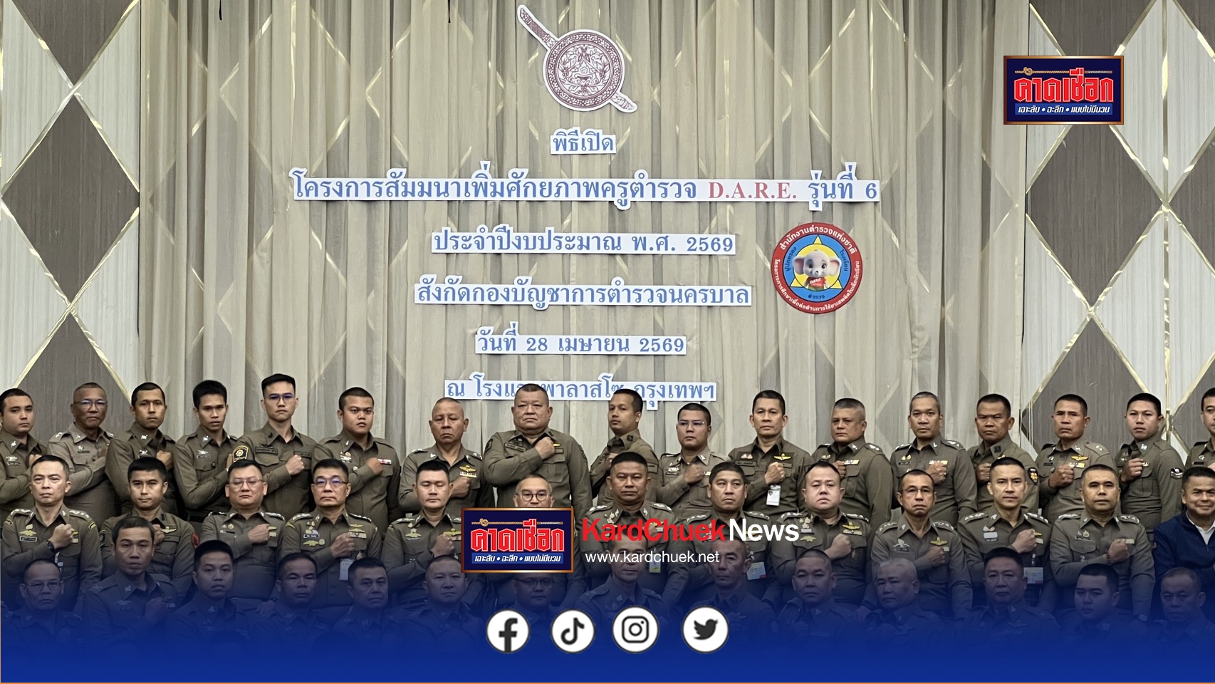 พล.ต.ท.อาชยน ไกรทอง ผบช.ปส. เดินทางเป็นประธานในพิธีเปิดการสัมมนาพร้อมด้วยผู้บังคับบัญชาในสังกัด บช.ปส. โดย บช.น. พล.ต.ท.สยาม บุญสม ผบช.น. มอบหมายให้ พล.ต.ต.ธีรเดช ธรรมสุธีร์ รอง ผบช.น. (รับผิดชอบยาเสพติด บช.น.) เข้าร่วมพิธีเปิด การสัมมนาเพิ่มศักยภาพครูตำรวจ D.A.R.E. (Drug Abuse Resistance Education) รุ่นที่ 6 ประจำปีงบประมาณ พ.ศ.2569 ในสังกัด บช.น. ระหว่างวันที่ 28 – 30 เมษายน 2569 พร้อมด้วย รอง ผบก.น.1 – 9 และ สส.